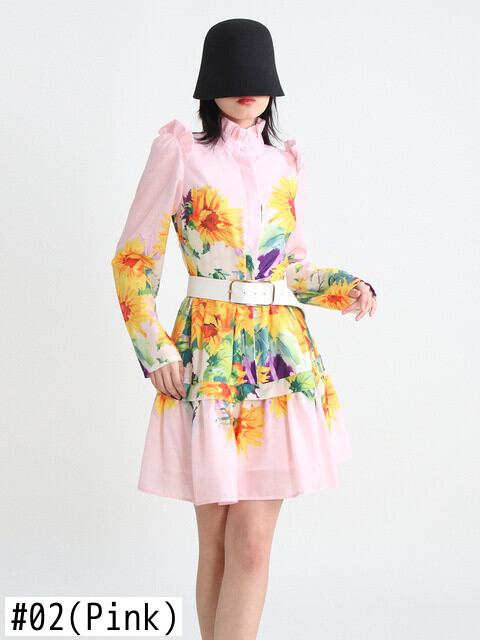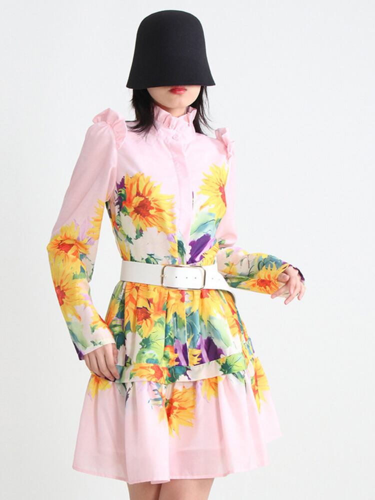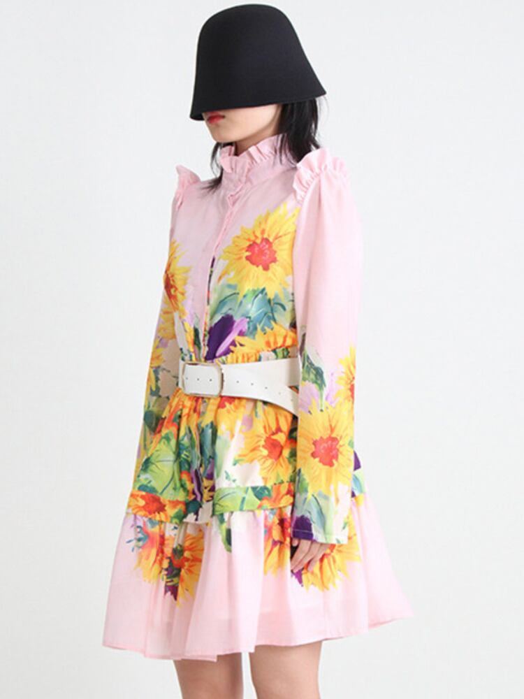 [EWQ] 甘い長袖フリルスプライスプリントミニドレスシングルブレストコントラストレースアップドレス春 Vestido ロング 大人ガーリー スウィート キュート カジュアル スプリング 春物