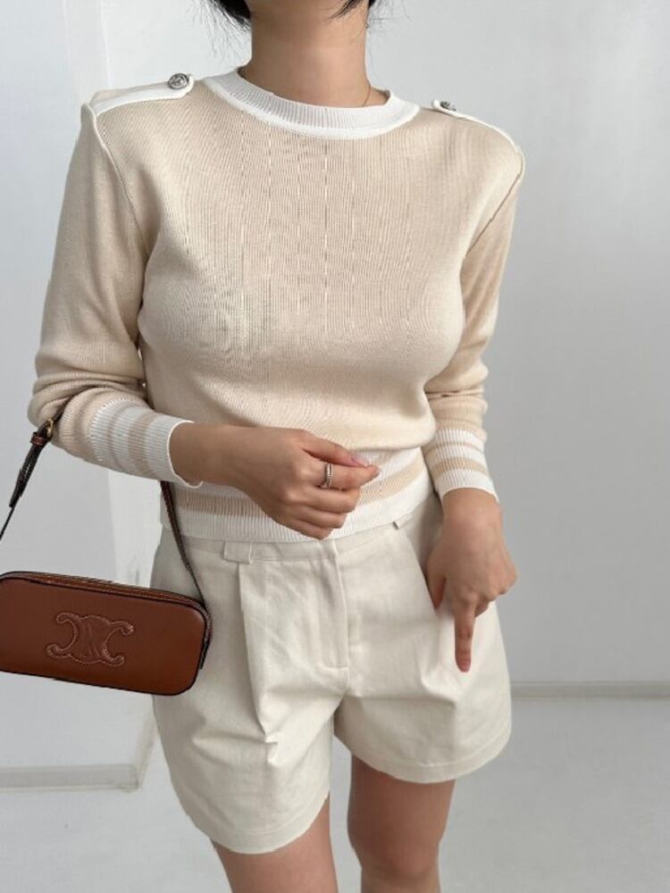 【EWQ】カラーブロック シンプル Oネック セーター レディース ショルダー ゴールドボタン プルオーバー ニット 春 秋 コントラスト トップス スプリング 春物 オータム 秋物