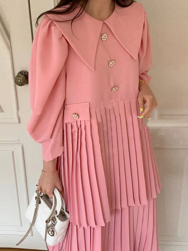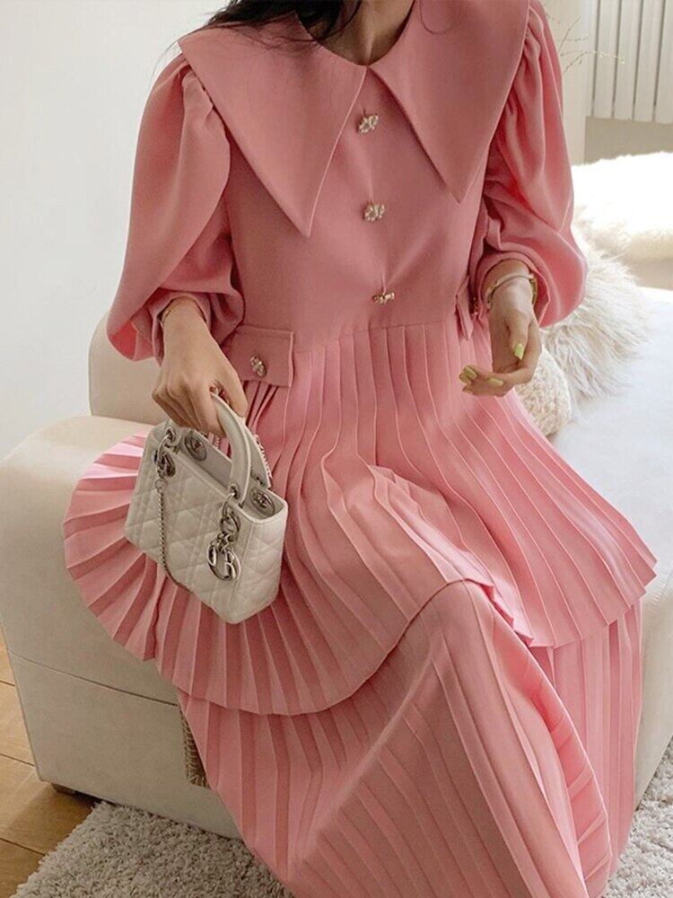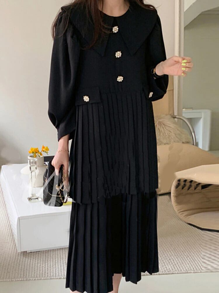 [EWQ] 甘いかわいいプリーツ ピーターパン襟ドレス パフ スリーブ パール ボタン装飾半ばふくらはぎ夏 16T129 大人ガーリー スウィート キュート カジュアル サマー 夏物 真珠