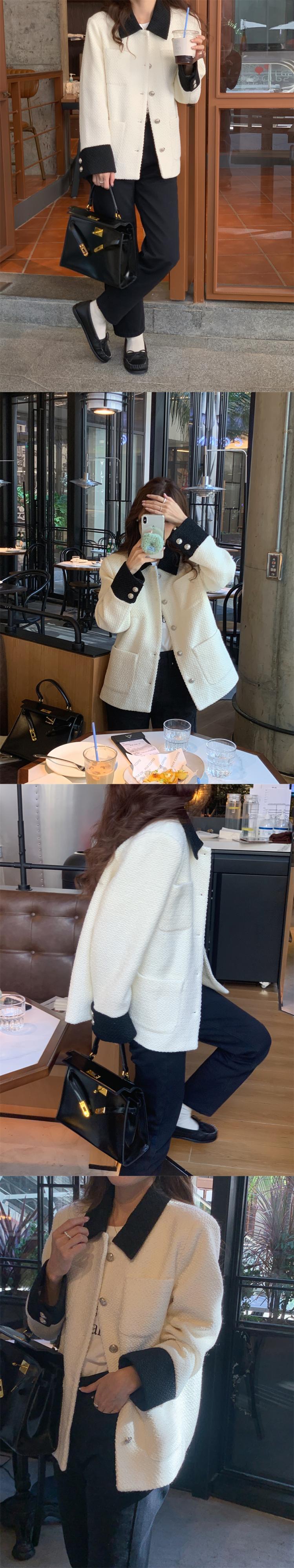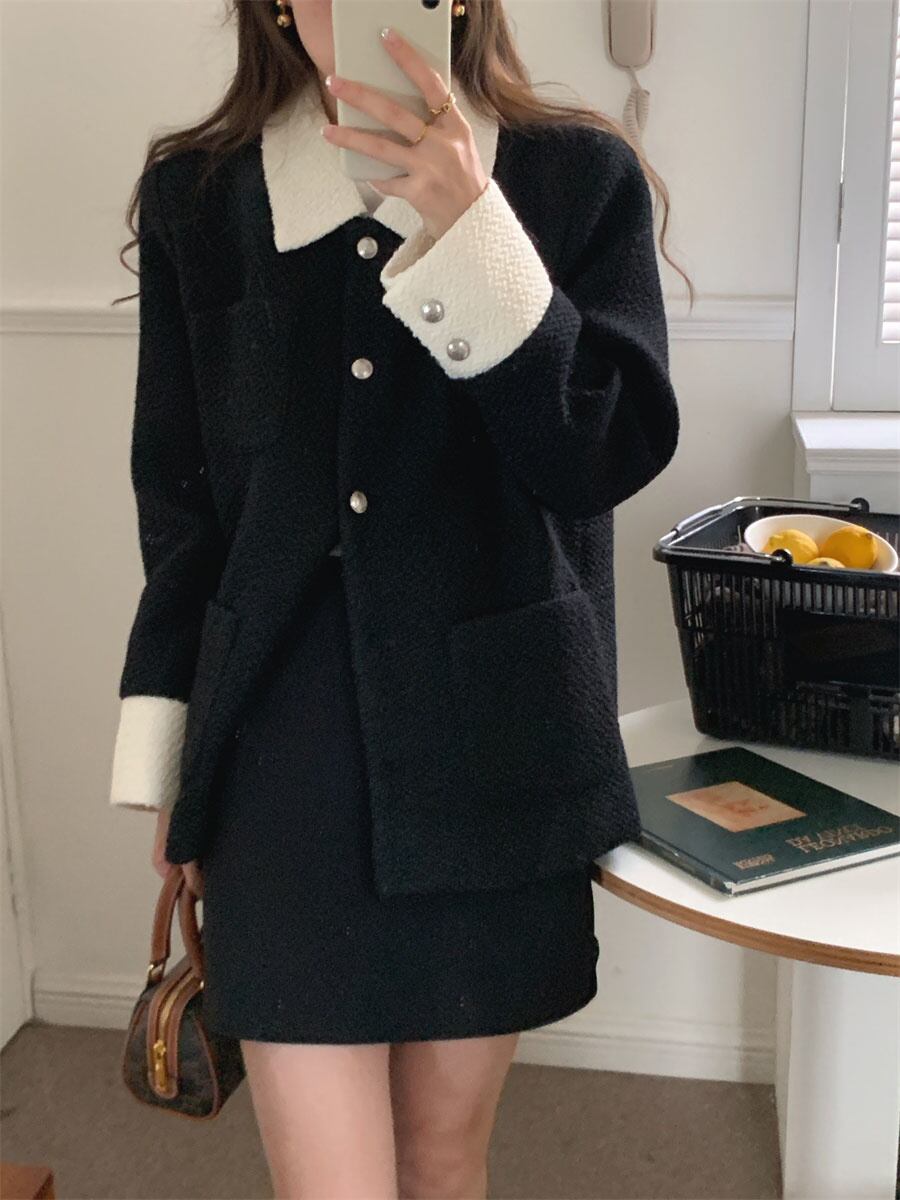 [EWQ] ターンダウンカラーコントラストツイードウールジャケットパッチワークシングルブレストウールブレンドコート春秋 スプリング 春物 オータム 秋物