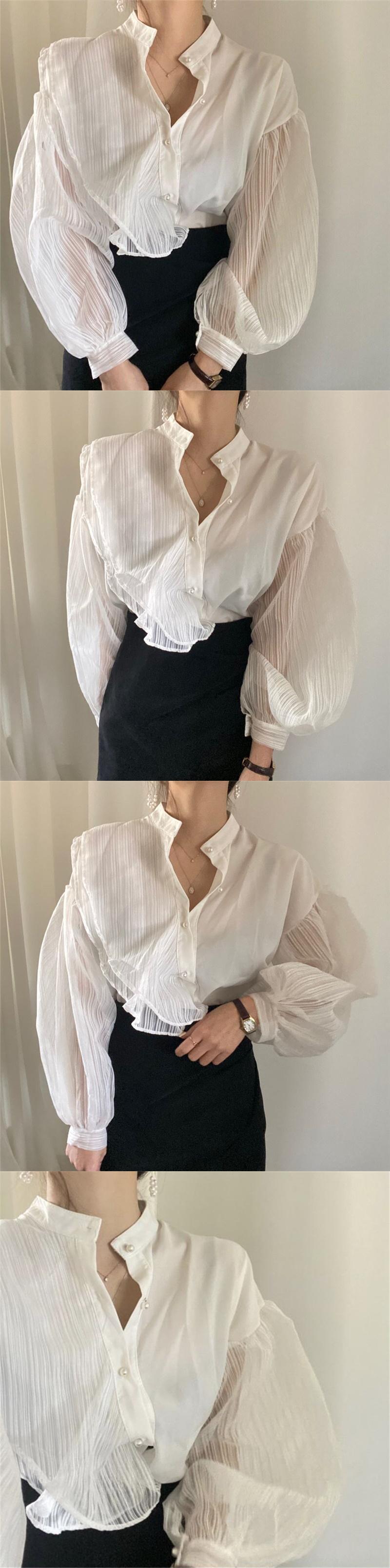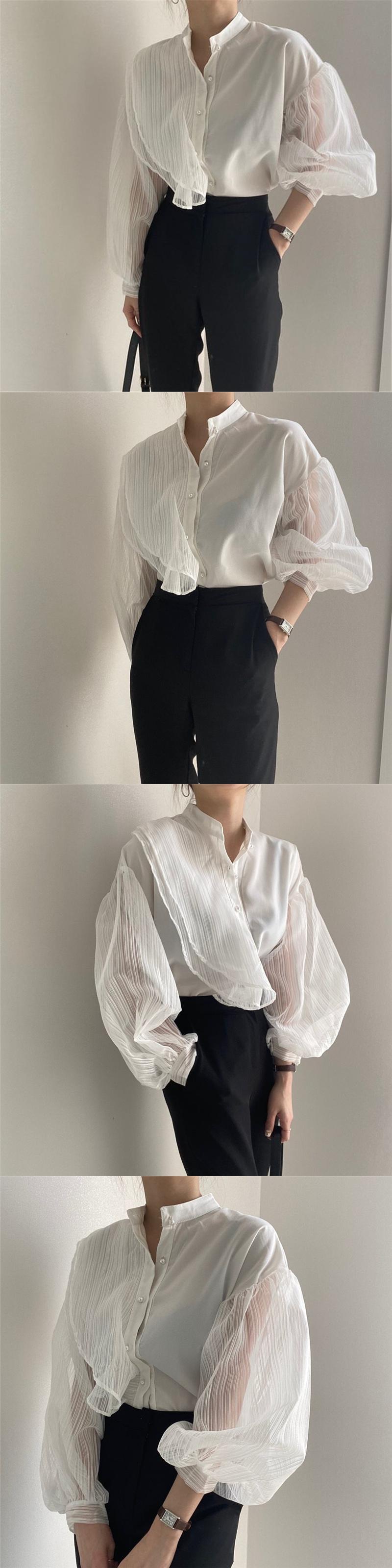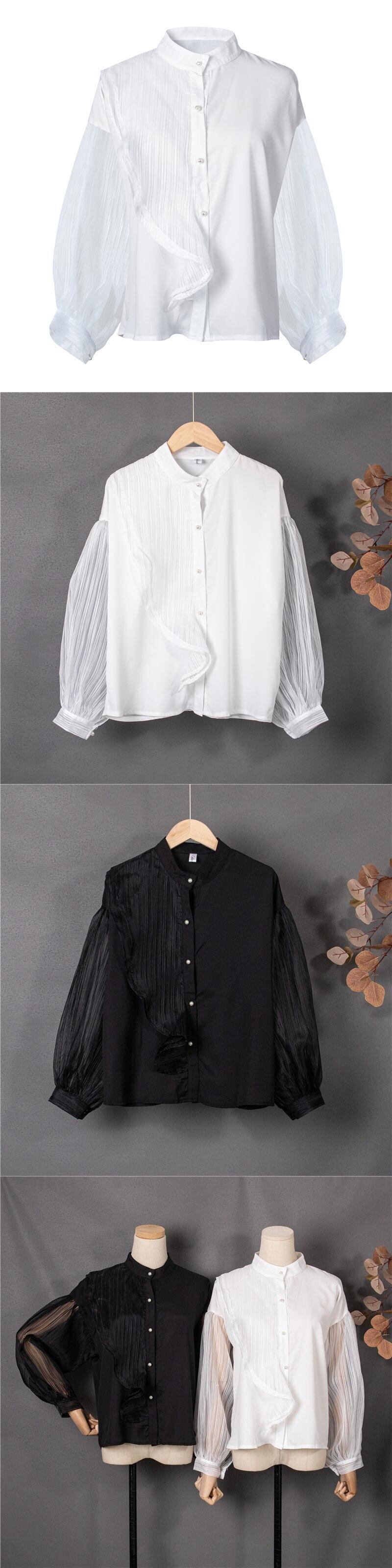 【EWQ】パッチワーク メッシュ ランタンスリーブ ブラウス レディース スタンドカラー シングルブレスト 無地 春秋 16Y790 スプリング 春物 オータム 秋物 ソリッドカラー