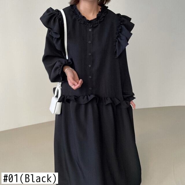 【EWQ】シック気質 優しいラウンドネックファンガスフリルスプライシング シングルブレスト ゆったり長袖ワンピース タイド 16E4751 ロング Oネック