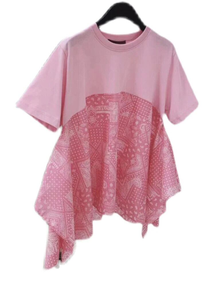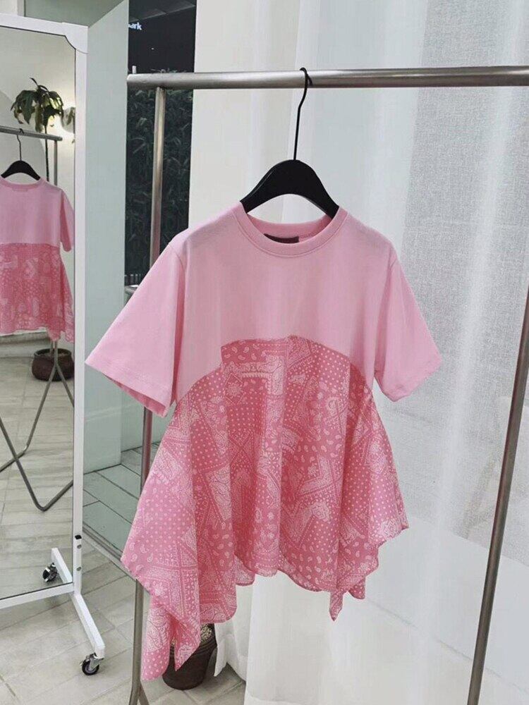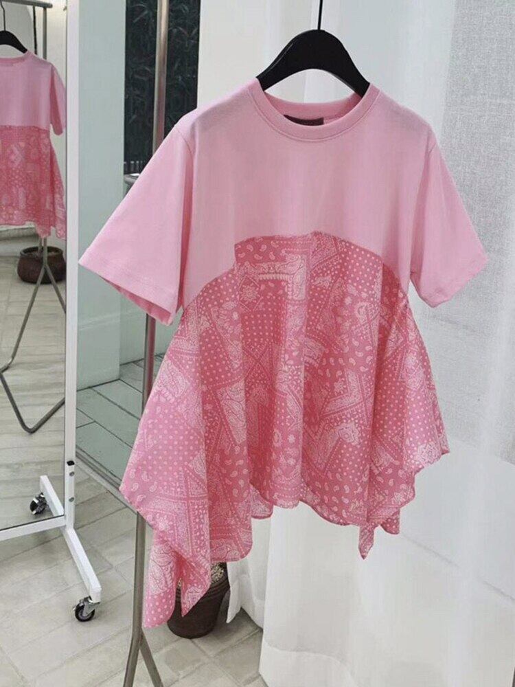 [EWQ] パッチワーク印刷不規則テストップ O ネック半袖 Tシャツ夏ピンク Tシャツ 6Y7362 ショート ハーフスリーブ サマー 夏物 Oネック