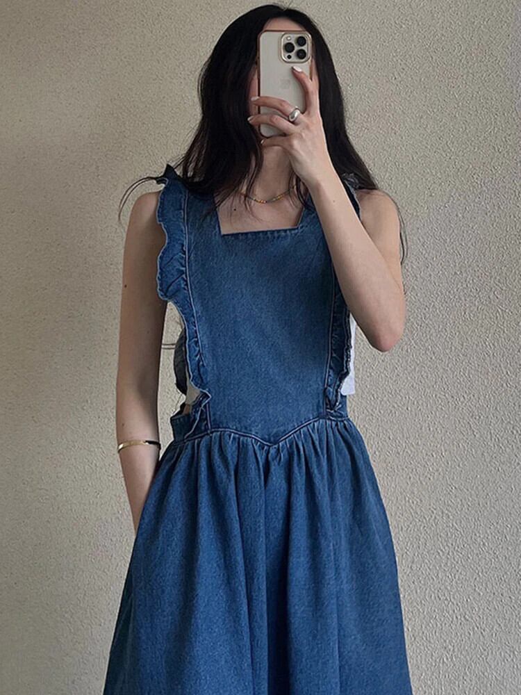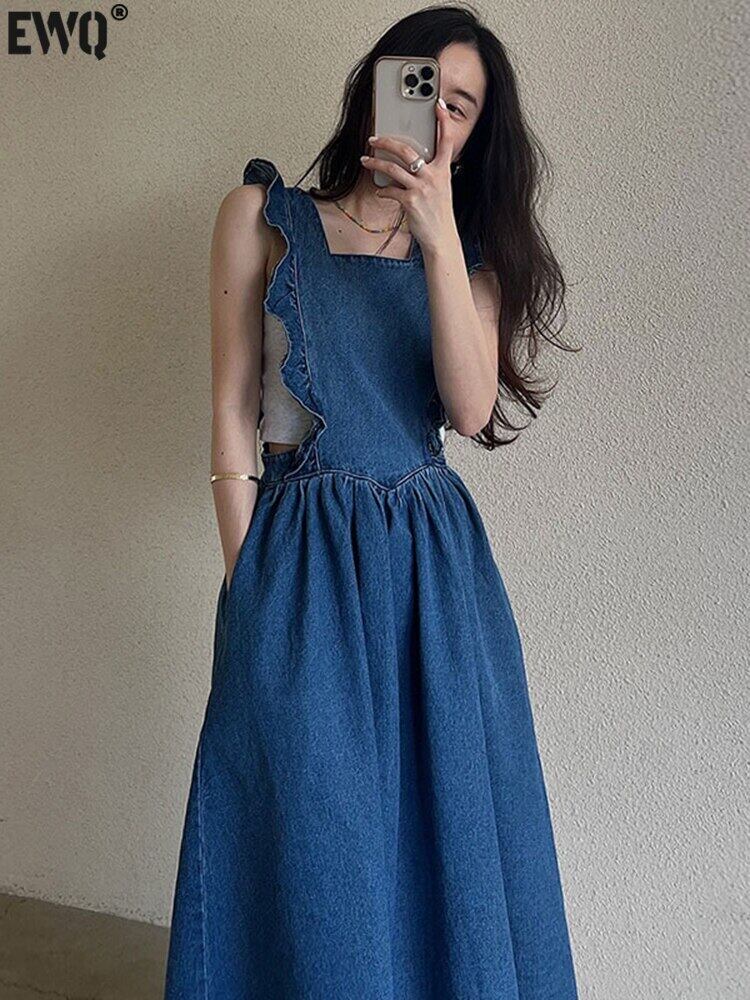 [EWQ] スクエアカラー パッチワーク サイドオブファンガス ノースリーブ デニム ドレス レディース カジュアル ドレス 夏 16Y1314 サマー 夏物 スクウェア