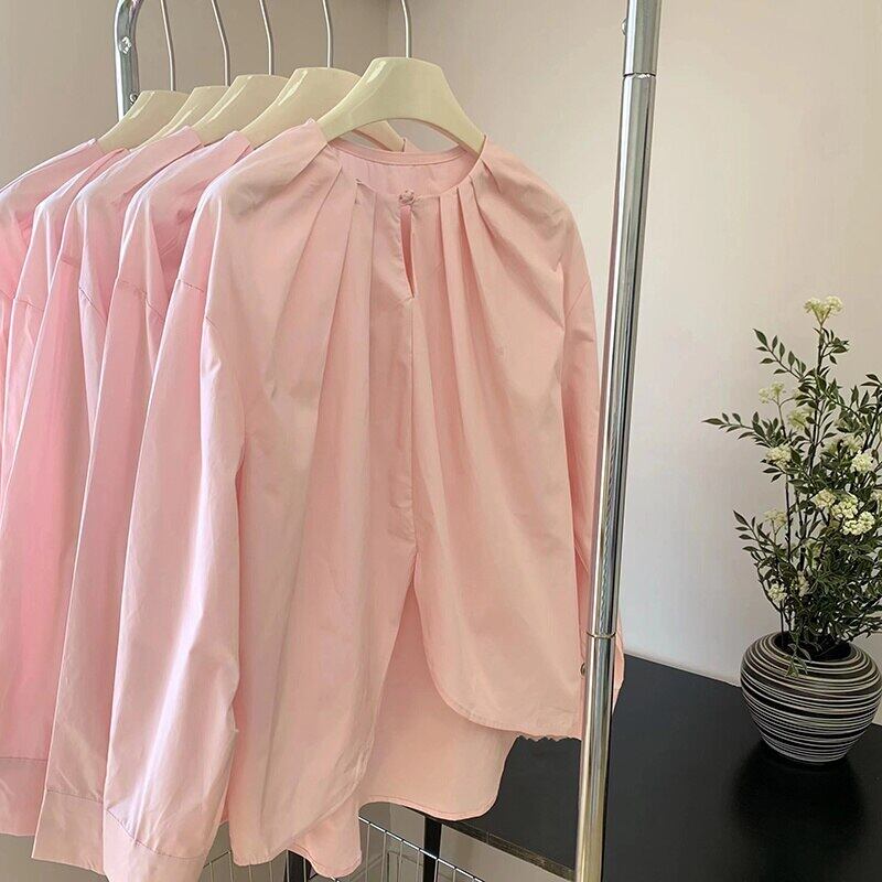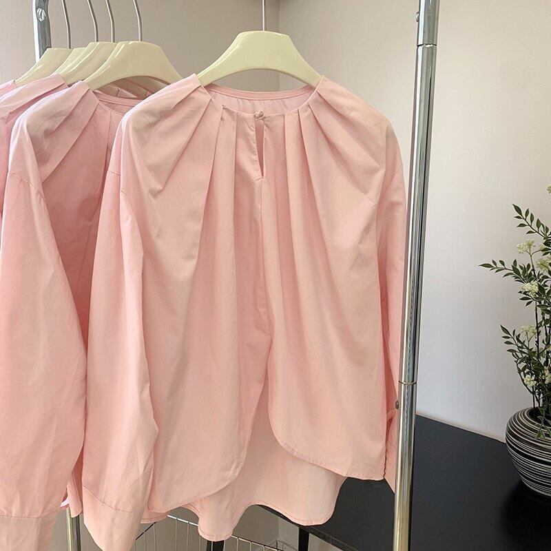 [EWQ] シック ワンボタン ピンク シャツ レディース 長袖 無地 トップス 春 夏 イレギュラー シャツ トップス ロング スプリング 春物 サマー 夏物 ソリッドカラー