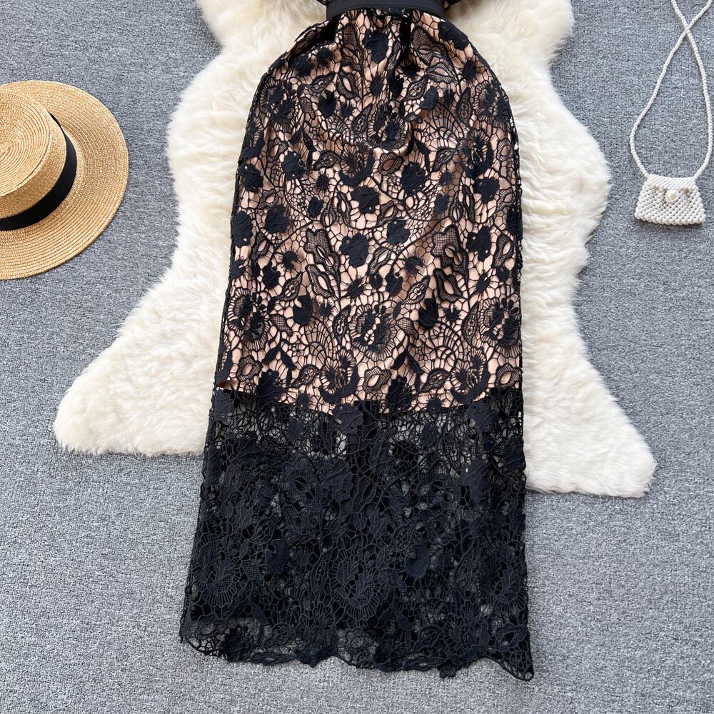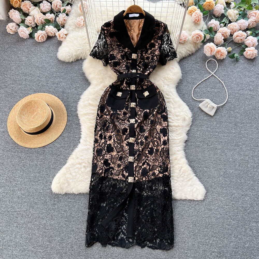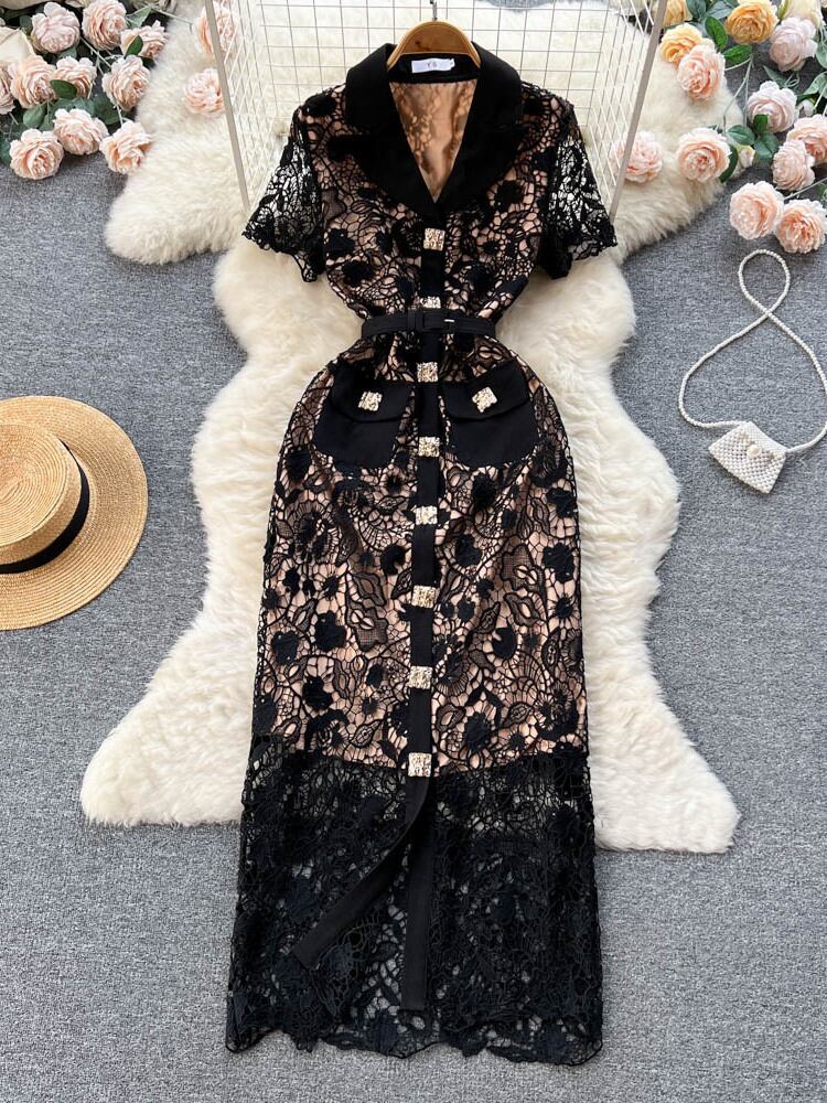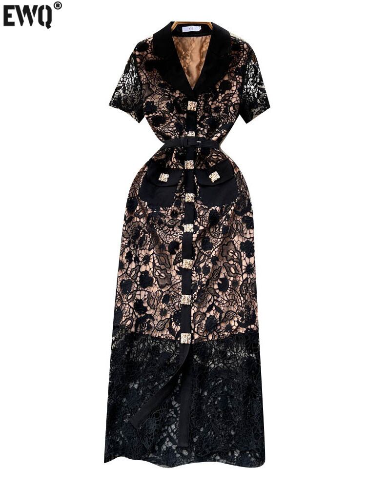 [EWQ] レースフック花シックボタンドレス Embroid シングルブレストレースアップパーティードレス夏潮 Vestido 6Y8133 刺繍 サマー 夏物 フラワーデザイン