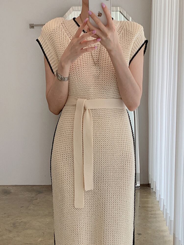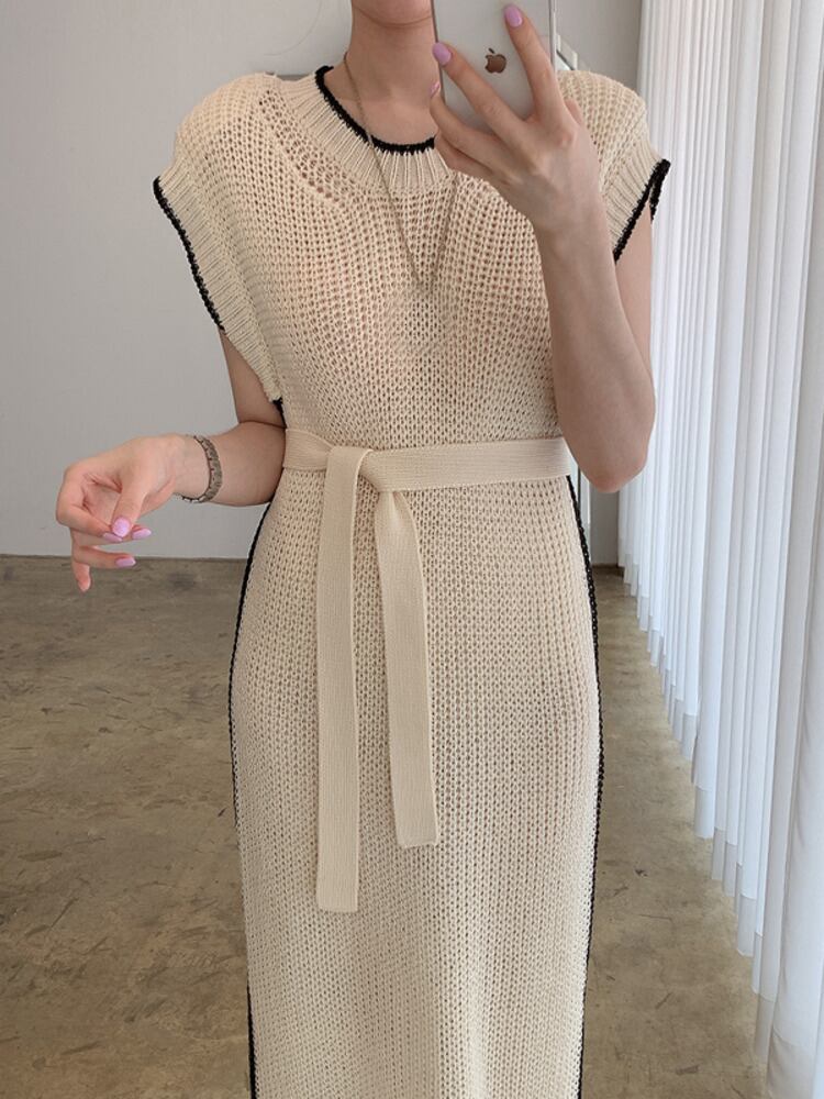 [EWQ] O ネック コントラスト ニット ドレス サマー レースアップ ノースリーブ ベスト ニット ドレス オールマッチ 服 カーキ ローブ 夏物 Oネック