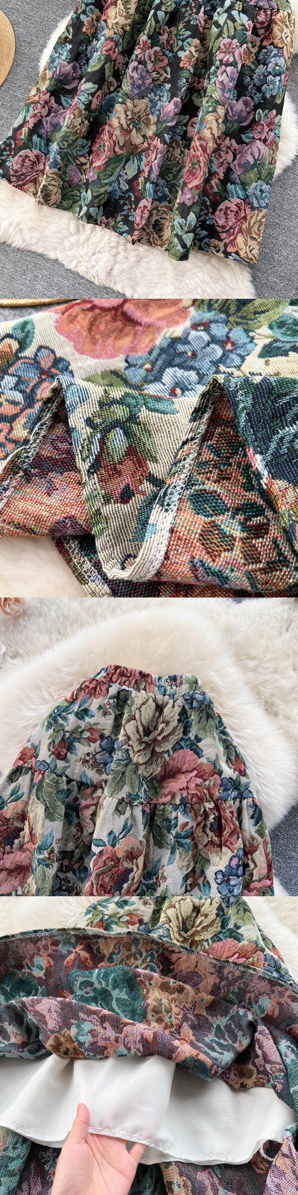 [EWQ] プリント刺繍 A ラインスカート弾性ウエストミッドカーフスカート春夏フローラルコントラスト段 Faldas エラスティック 伸縮 スプリング 春物 サマー 夏物 花柄 Aライン