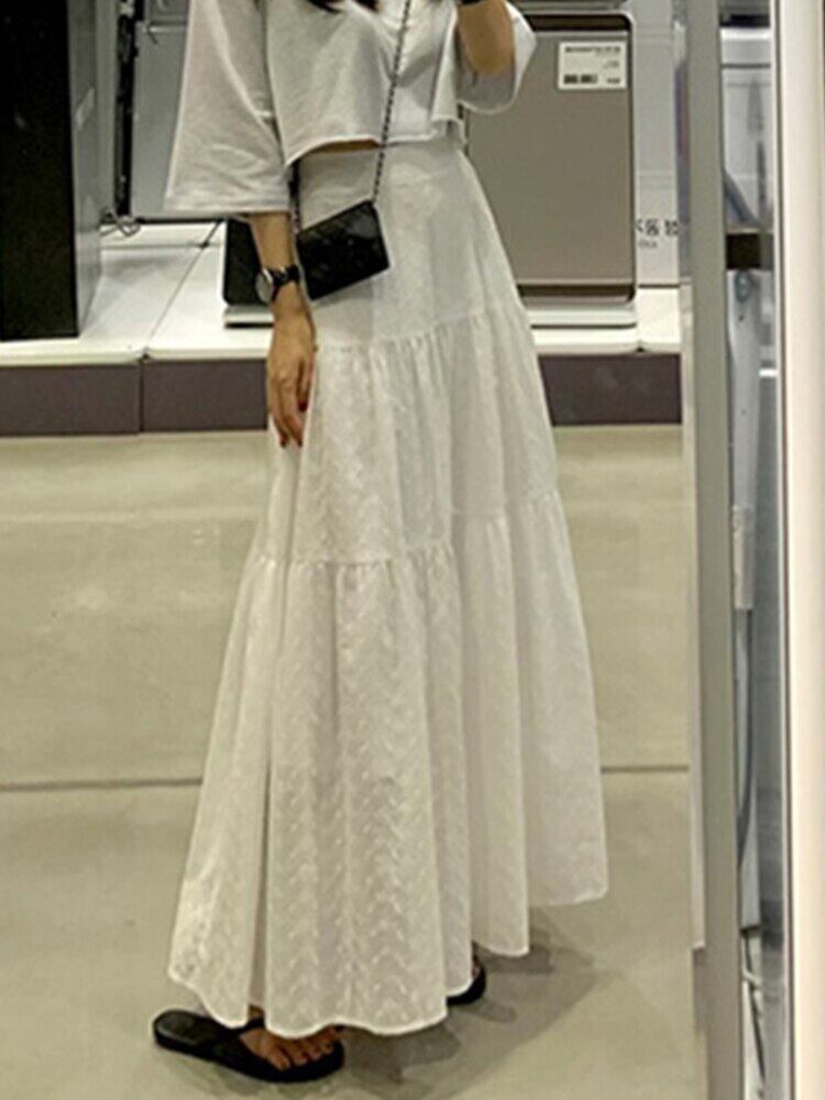 【EWQ】ウエストゴムAラインスカート無地ホックフラワーミッドカーフスカート夏オールマッチ服 エラスティック 伸縮 サマー 夏物 ソリッドカラー フラワーデザイン