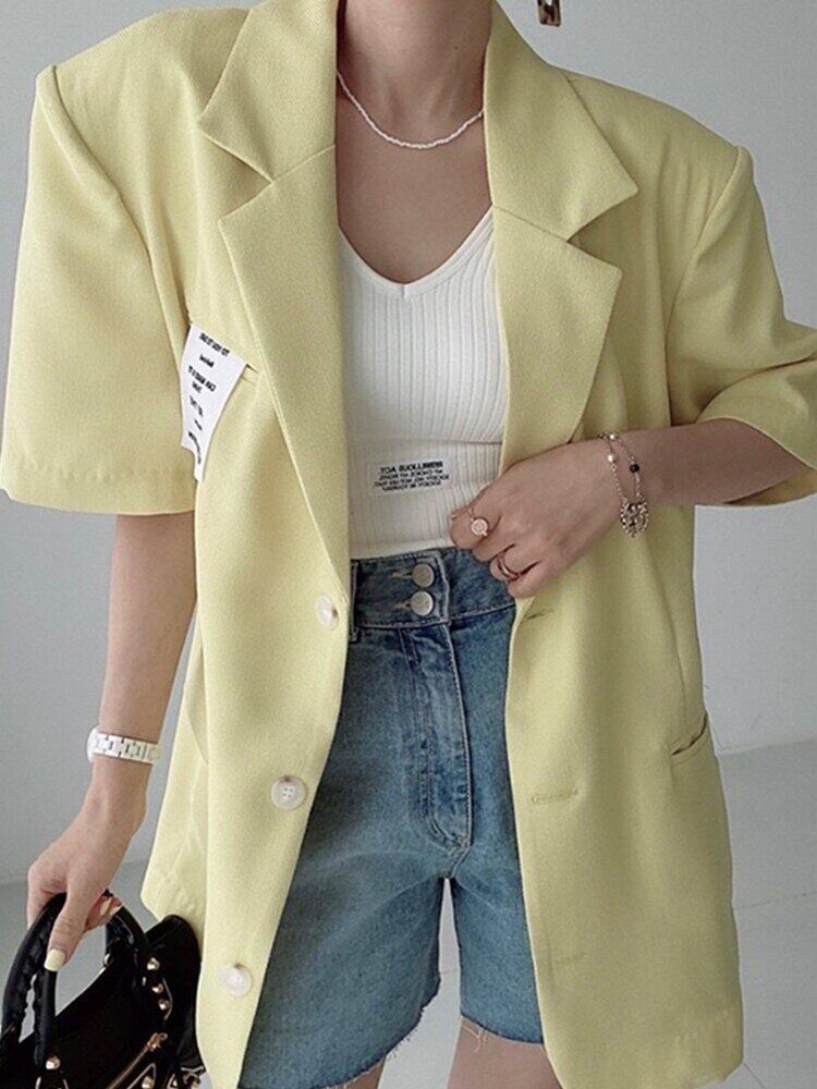 [EWQ] レディース ノッチレター 半袖 ブレザー コート イエロー シングルブレスト スーツ ジャケット 春夏 トップス 16Y6937 ショート ハーフスリーブ スプリング 春物 サマー 夏物