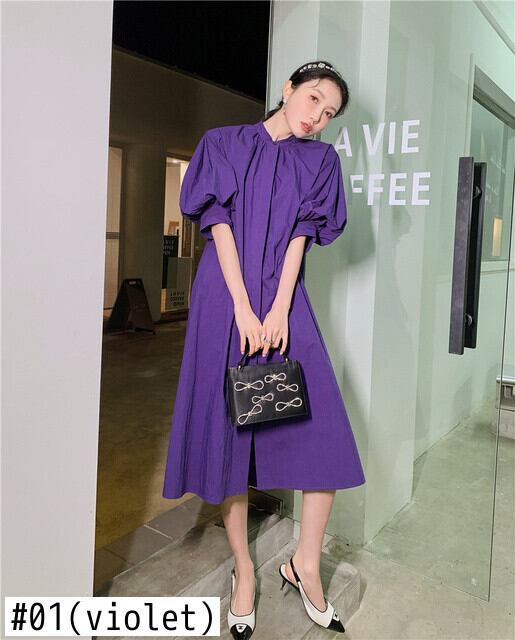 [EWQ] ランタン スリーブ ドレス ルーズ O ネック プリーツ シングル ブレスト ドレス サマー ローブ 6Y7532 ランタンスリーブ 夏物 Oネック