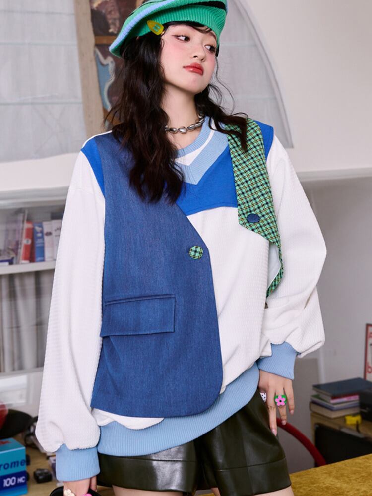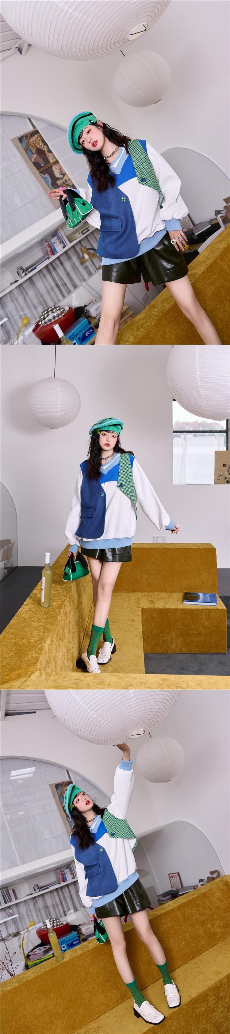 [EWQ] O ネック フェイク ツーピース スウェットシャツ長袖コントラスト カラー プルオーバー春秋トップ 747 ロング スプリング 春物 オータム 秋物 Oネック