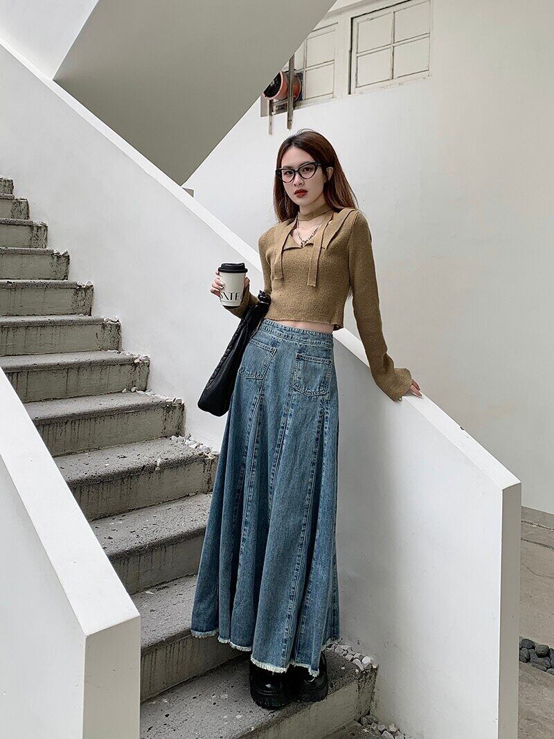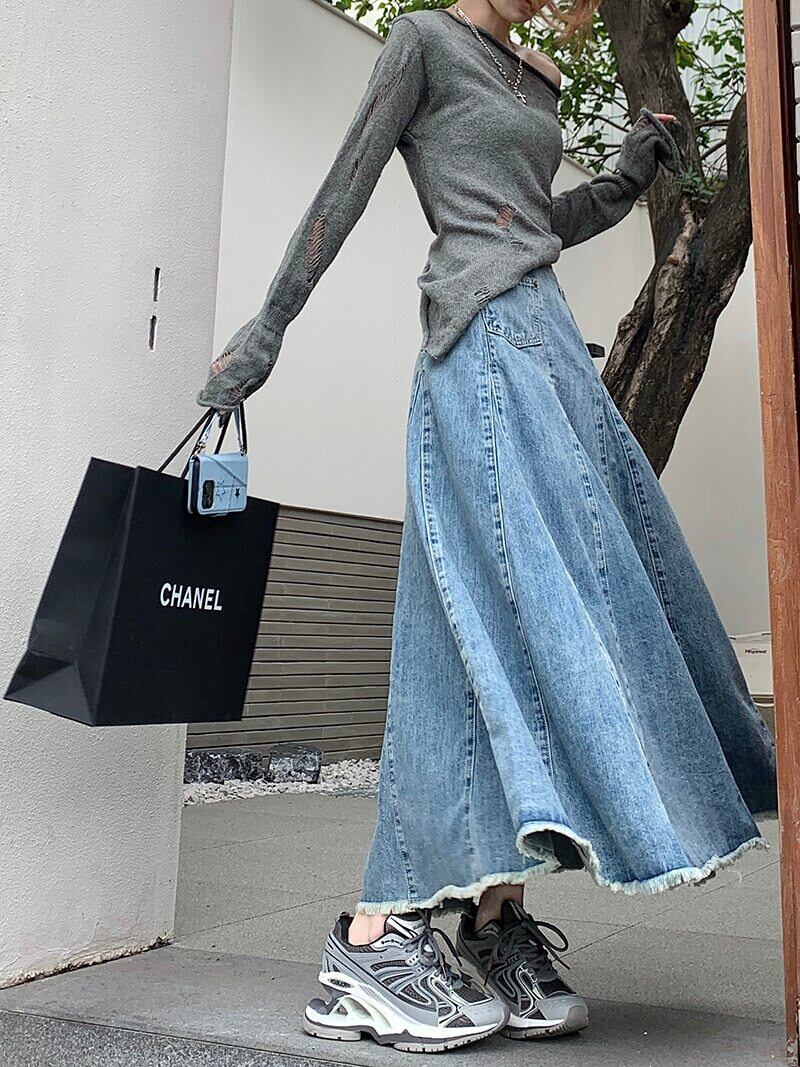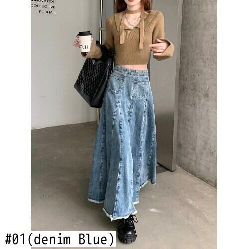 [EWQ] ウエスト デニム スカートポケット電話 A ライン スカート春夏ストリート ミッドカーフ ファルダ Y6597 スプリング 春物 サマー 夏物 Aライン
