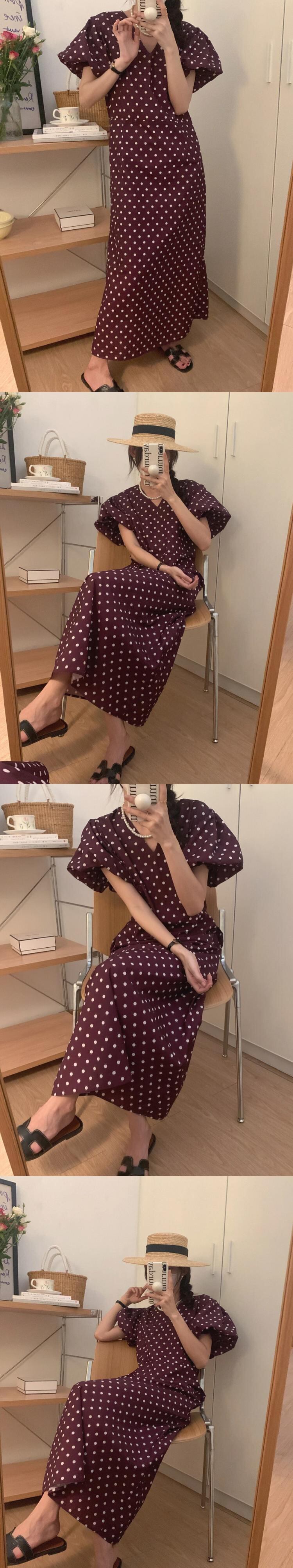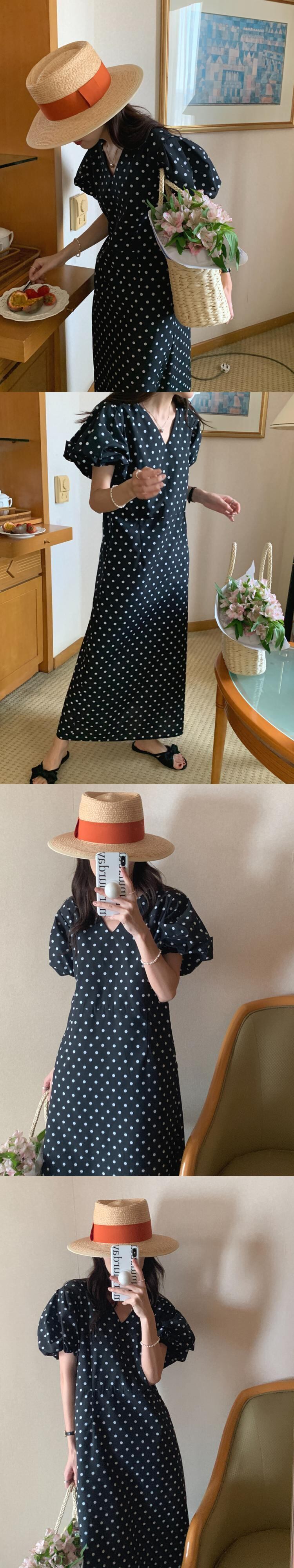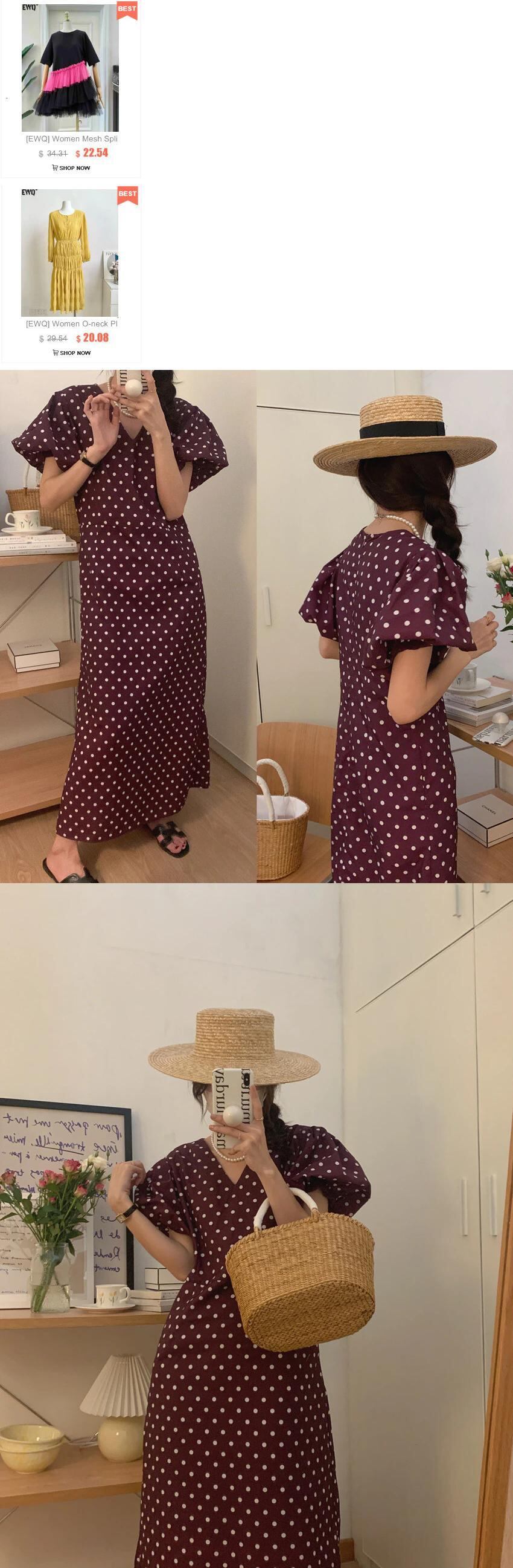 [EWQ] V ネック コントラスト ポルカ ドット ドレスバック スプリット パフ スリーブ ドレス夏ルーズ Vestido 7260 サマー 夏物 Vネック