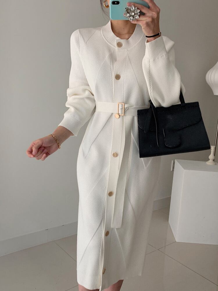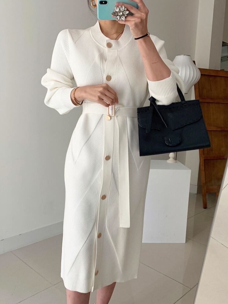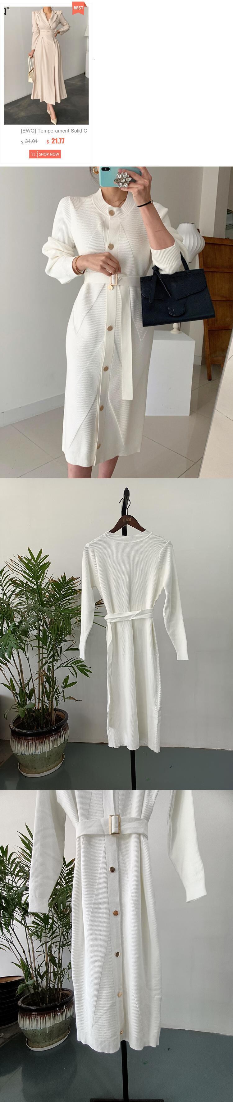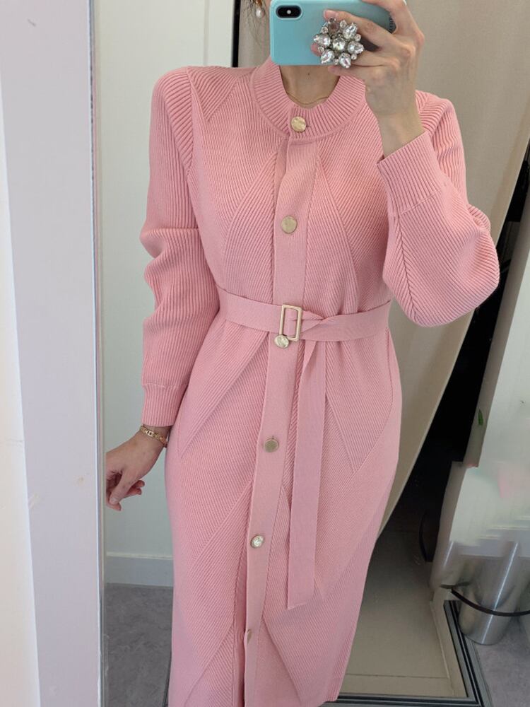 【EWQ】Festive Vestido シンプル クイーン ロング ニット ピンク ワンピース Oネック ミドル丈 ニットワンピース ベルト付き 春 冬 スプリング 春物 ウィンター 冬物 ハーネス
