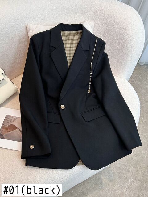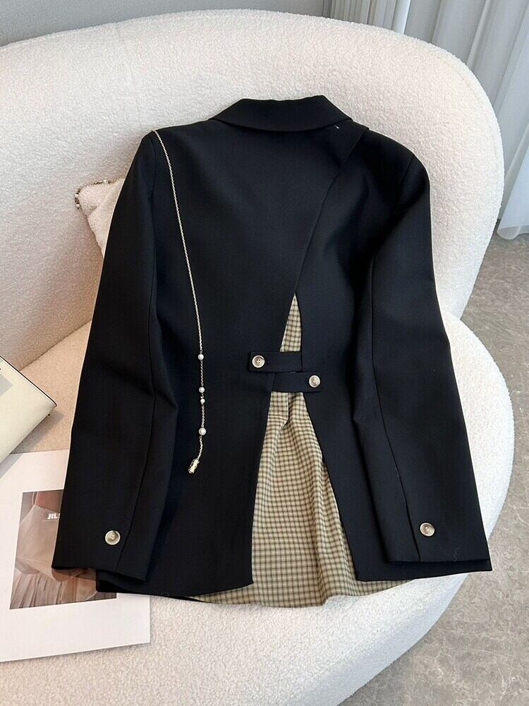 [EWQ] チェック柄裏地を継ぎ合わせ可能黒ブレザー ジャケットシックボタン長袖スーツ コート春秋 ロング ブラック スプリング 春物 オータム 秋物