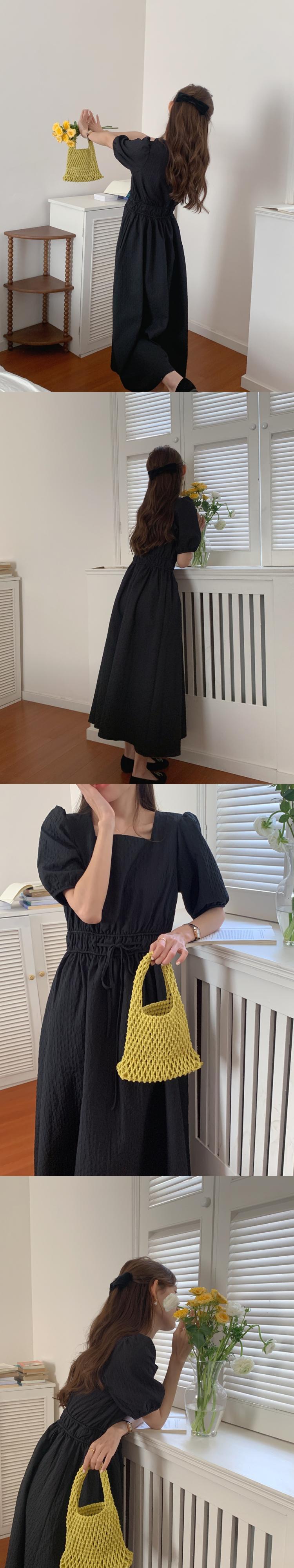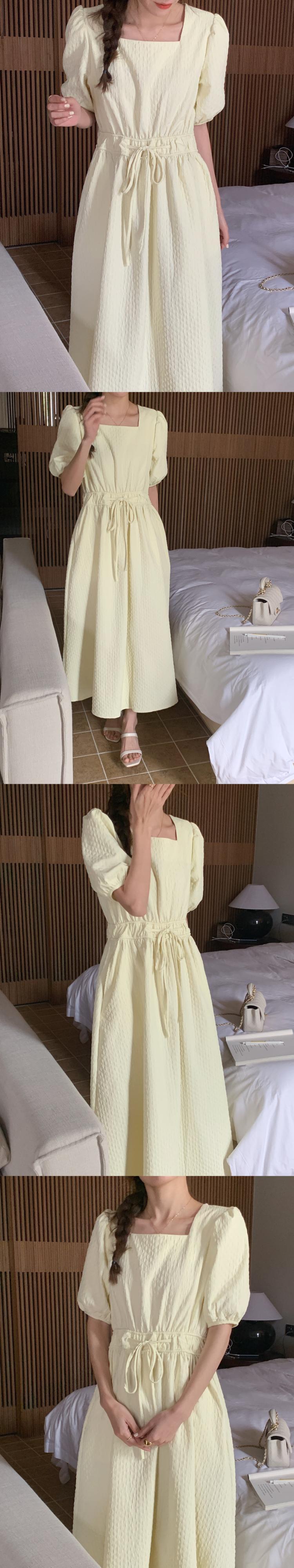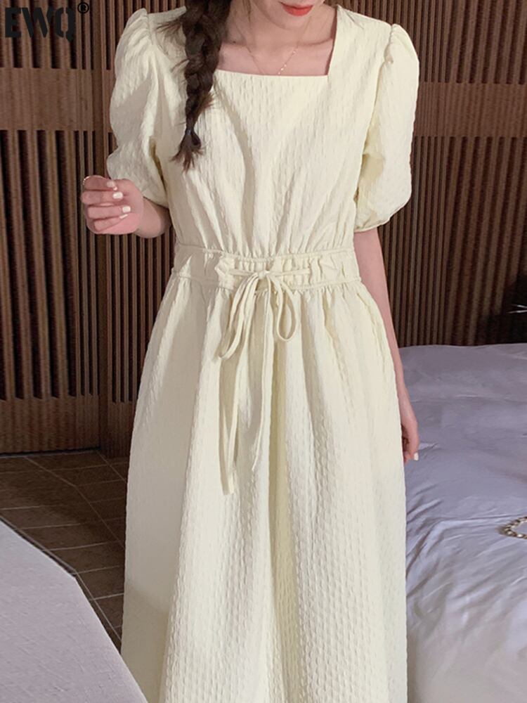 [EWQ] 甘いパフスリーブレースアップドレス夏無地スクエアカラードレス Vestido 546 大人ガーリー スウィート キュート カジュアル サマー 夏物 ソリッドカラー スクウェア