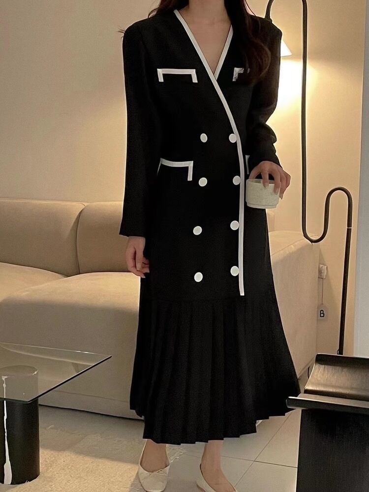 [EWQ] シック長袖ダブル ブレストフリル スプライシング ポケット ドレス春秋 ロング スプリング 春物 オータム 秋物