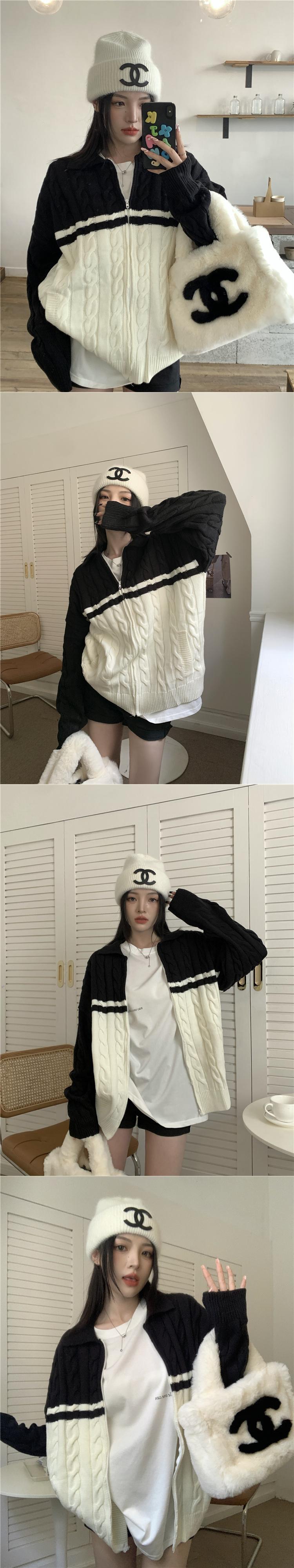 【EWQ】 ツイストカラー コントラスト セーター コート 春 シック レディース 長袖 ルーズ ジッパー ニット カーディガン 秋 トップス ロング スプリング 春物 オータム 秋物
