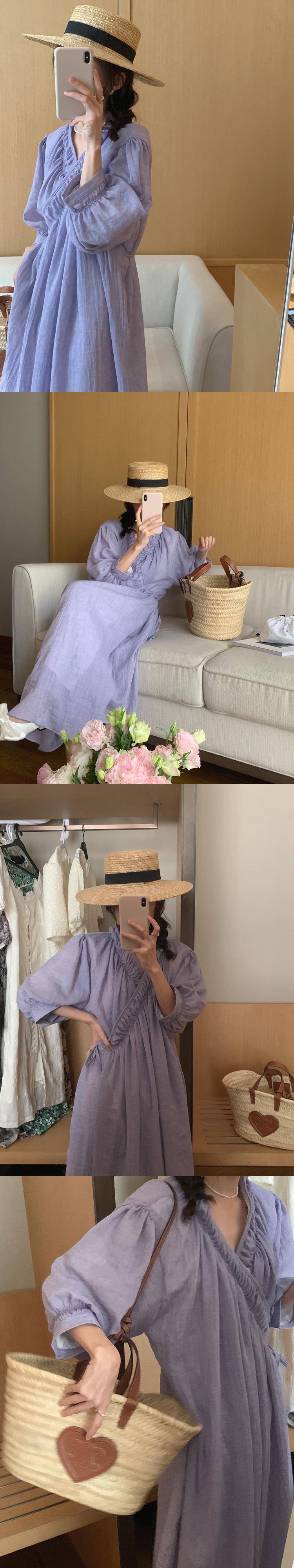 [EWQ] シックパープル V ネック クロス ルーズ バブル スリーブ無地ドレス夏スタイル 16Y911 サマー 夏物 Vネック ソリッドカラー