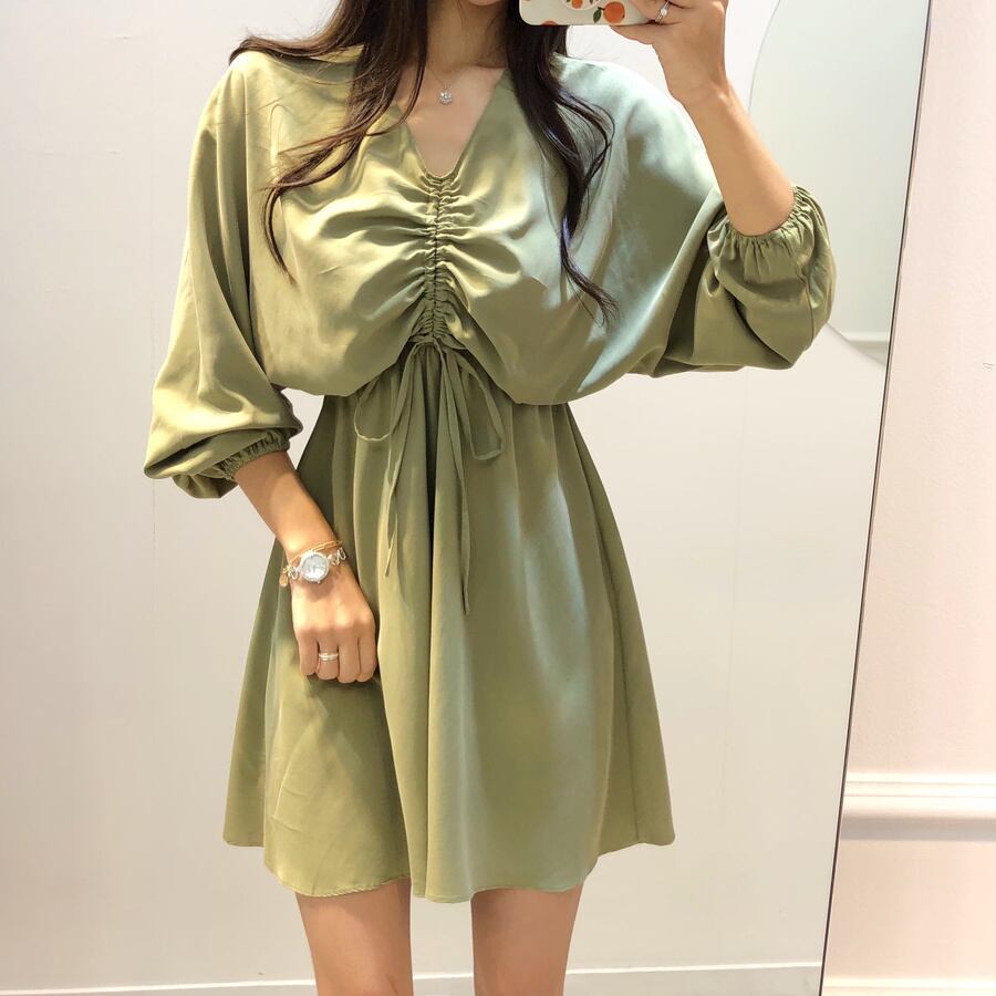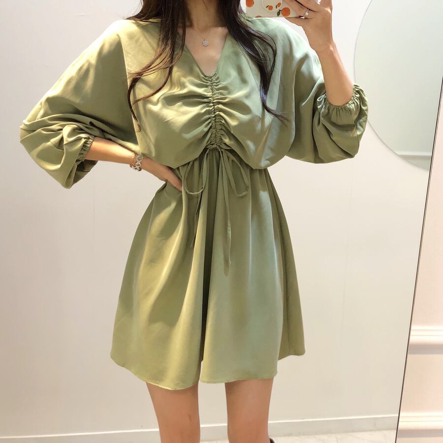 [EWQ] V ネック プリーツ ドローコード結ばれた弓巾着ドレスプリーツ ウエスト ミニ ドレス春夏 Vestido 6768 リボン スプリング 春物 サマー 夏物 Vネック