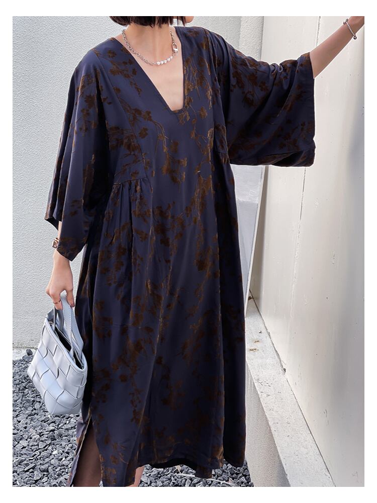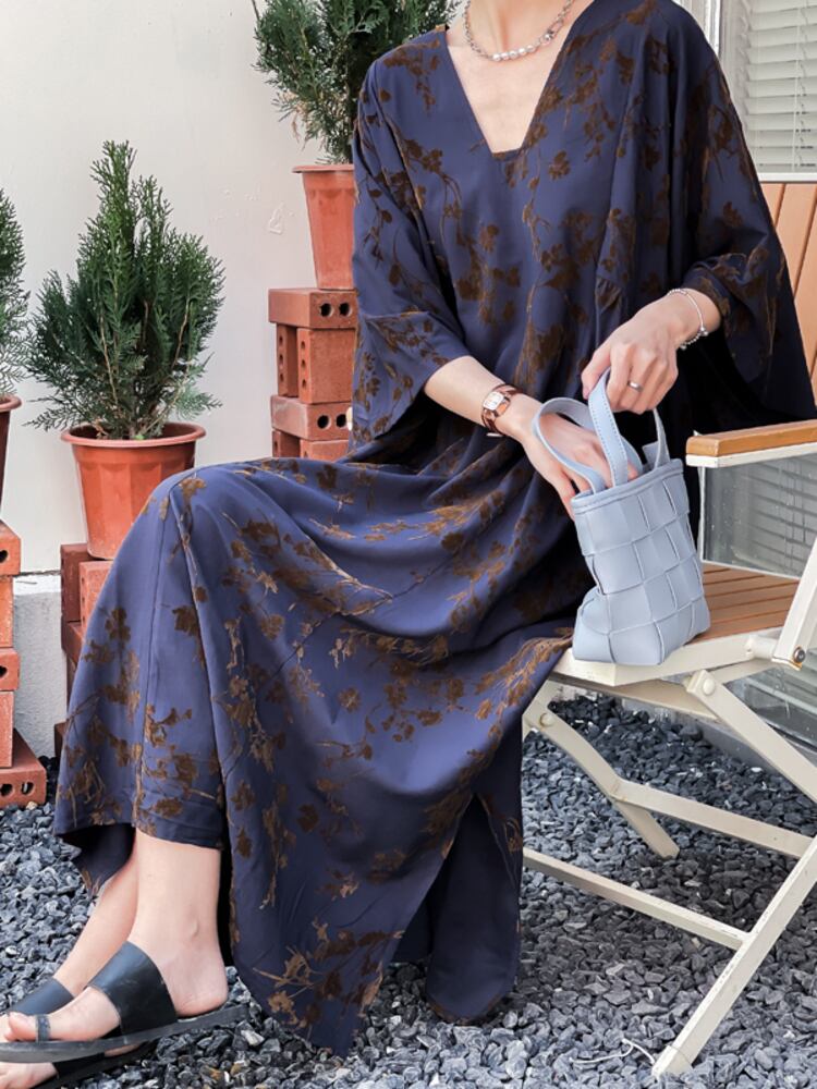 [EWQ] V ネック プリント ドレス レトロ ブルー フラワー オーバーサイズ ドレス 春夏 ソフト Tシャツ Vestido Rode 6Y6437 スプリング 春物 サマー 夏物 Vネック フラワーデザイン