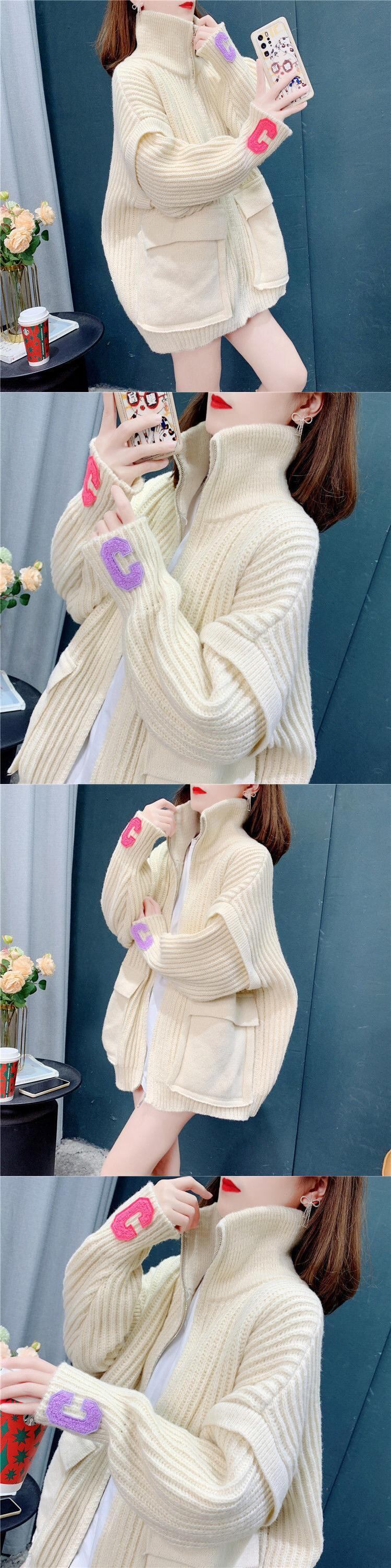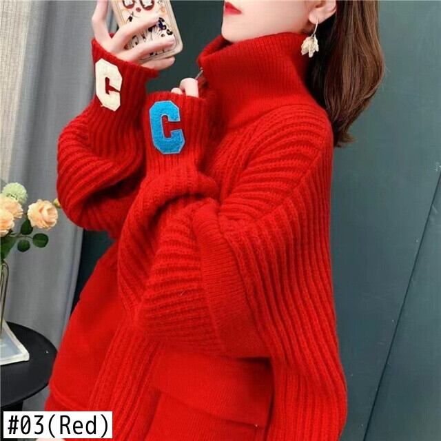 【EWQ】長袖 スタンドネック 厚手 あったか ニット ジャケット スプリング レター ジッパー レッド コート 16Y3424 ロング 春物