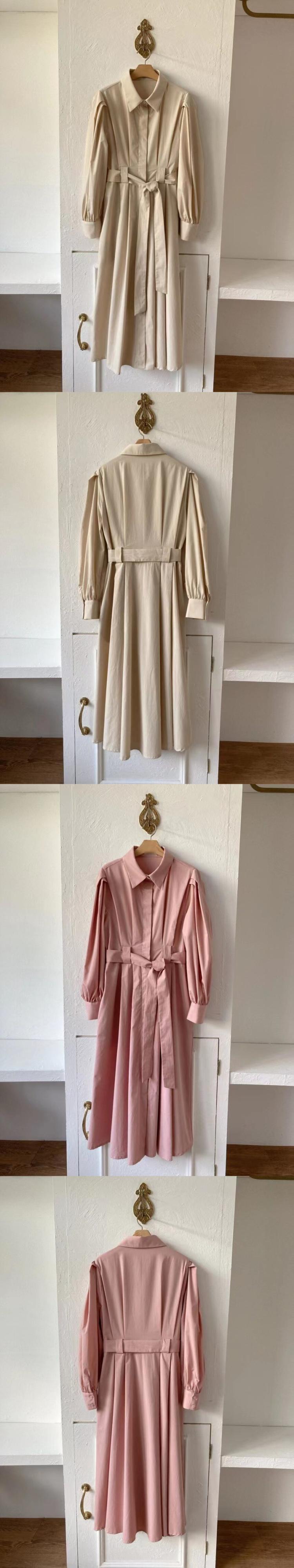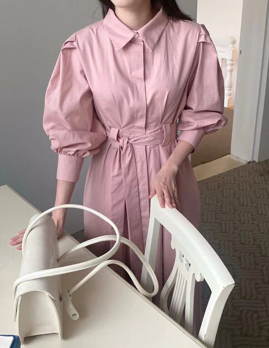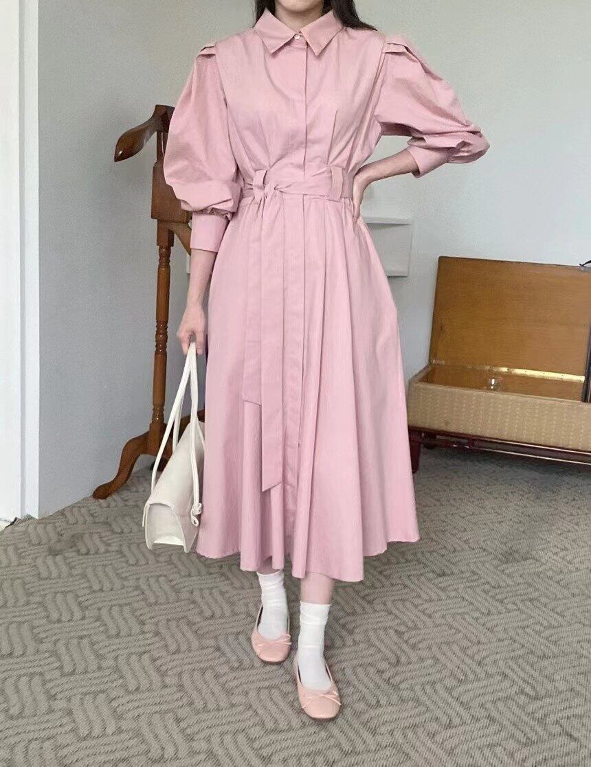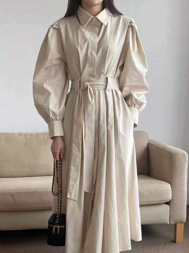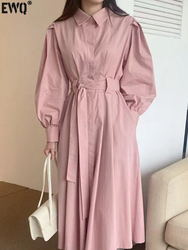 [EWQ] スウィート ラペル ポケット シャツ ドレスランタン スリーブ レースアップ ドレス春秋 Vestido 7252 ランタンスリーブ 大人ガーリー キュート カジュアル スプリング 春物 オータム 秋物