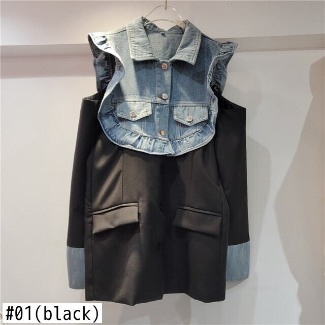 [EWQ] フリルオフショルダーデニムスプライスブレザーコートコントラストカラー長袖中空アウトスーツジャケット春秋 ロング スプリング 春物 オータム 秋物