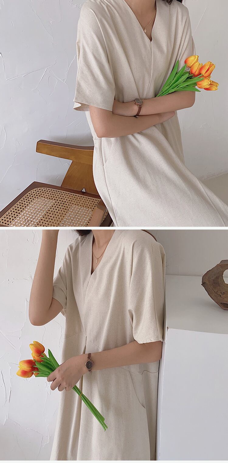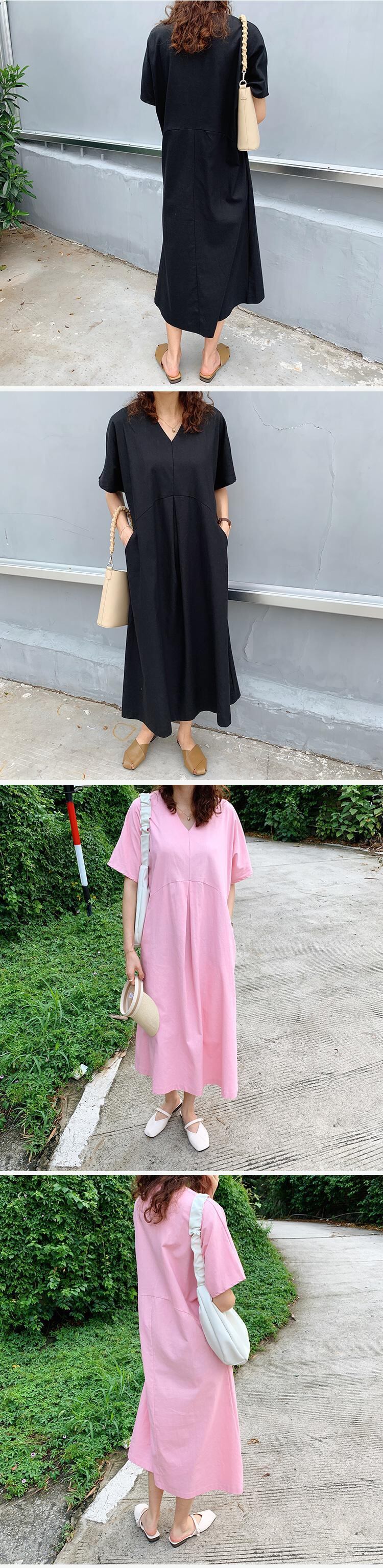 [EWQ] V ネック ゆったり 無地 ポケット ドレス シンプル 半袖 マキシ ドレス 夏 潮 Vestido 16Y8000 ショート ハーフスリーブ サマー 夏物 Vネック ソリッドカラー