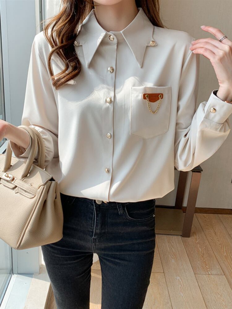 [EWQ] スウィート レディース 長袖 シックシャツ 春秋トレンド シングルブレスト メタルバッジ ブラウス 16Y60 ロング 大人ガーリー キュート カジュアル スプリング 春物 オータム 秋物