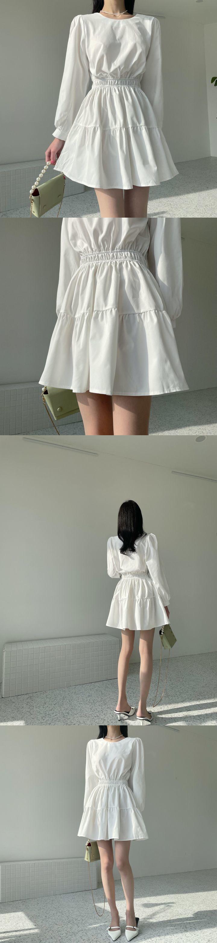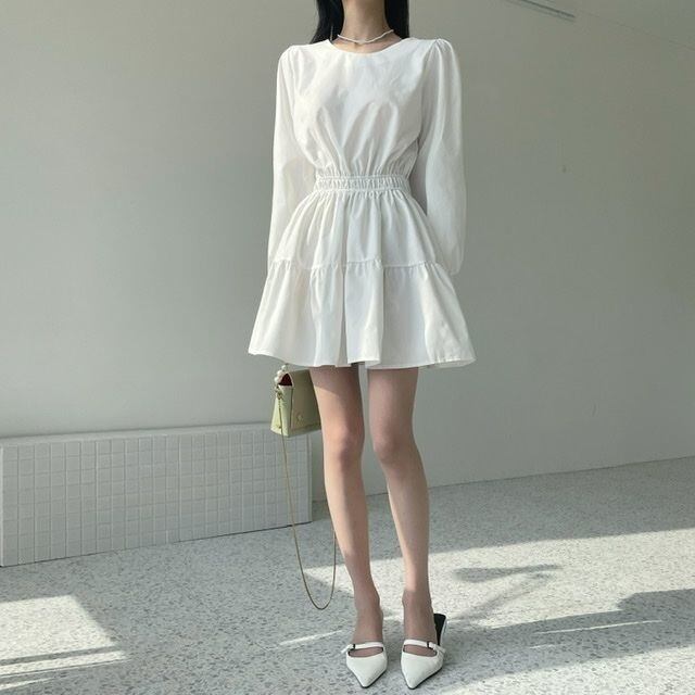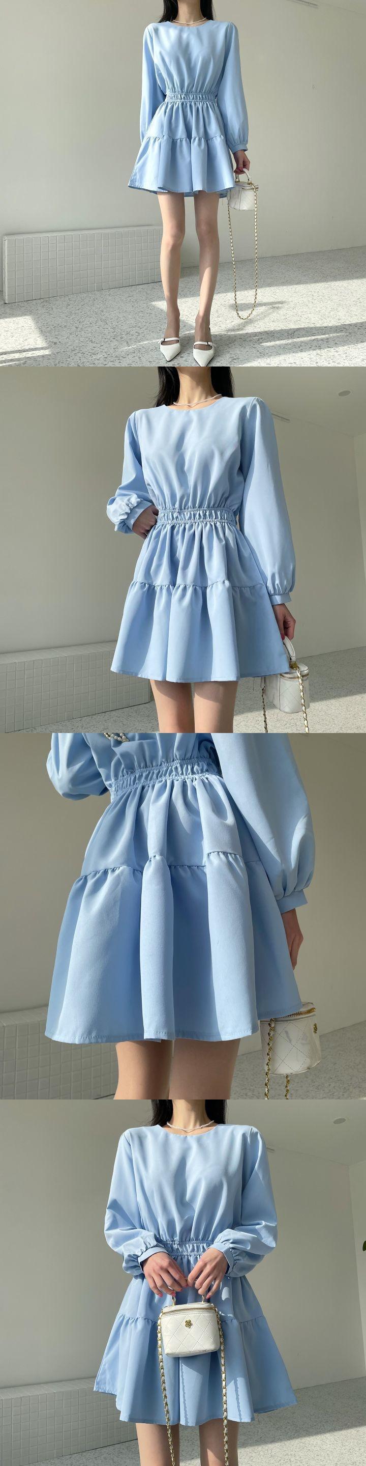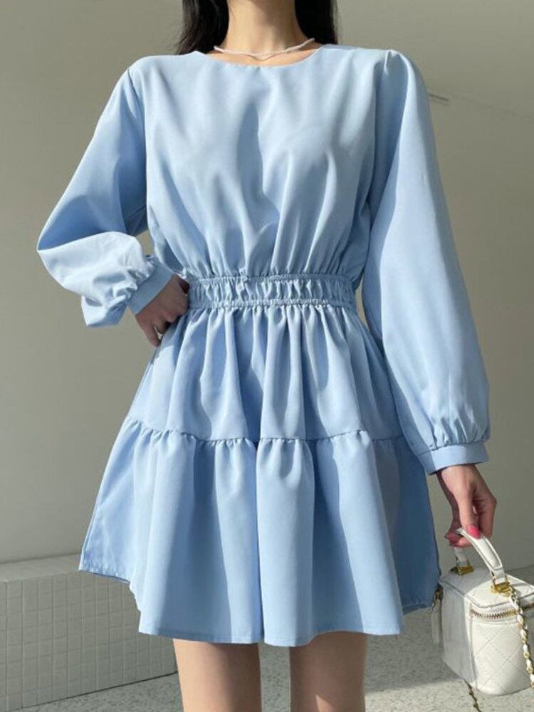 [EWQ] ミニマリストブルー O ネックミニドレスプリーツ弾性ウエストドレス春夏潮 A ライン Vestido 70 エラスティック 伸縮 スプリング 春物 サマー 夏物 Oネック Aライン