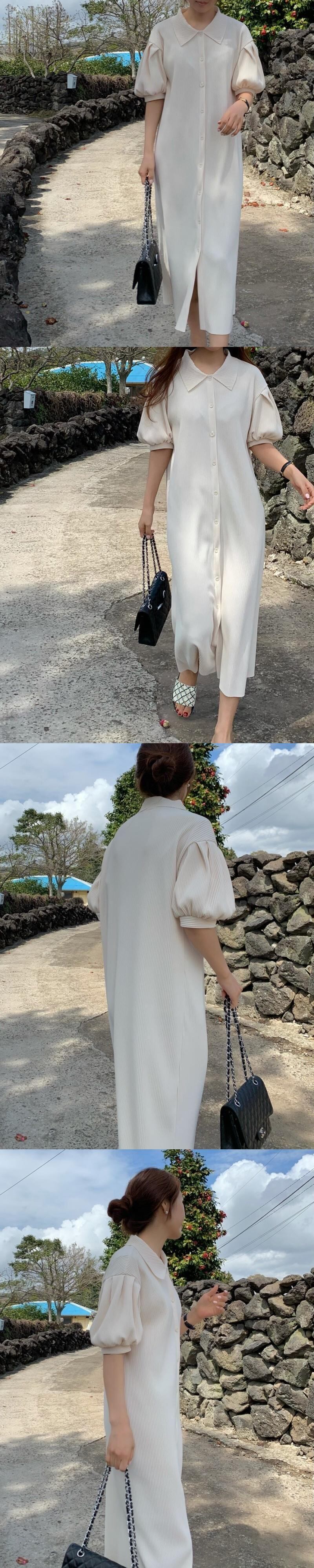 [EWQ] シックプリーツ ストライプ ミッドカーフ ドレス秋ゆるいラペル シングル ブレスト パフ スリーブ ドレス ピンク 16R578 オータム 秋物
