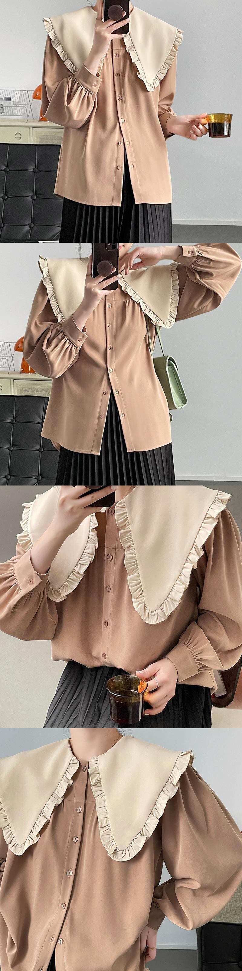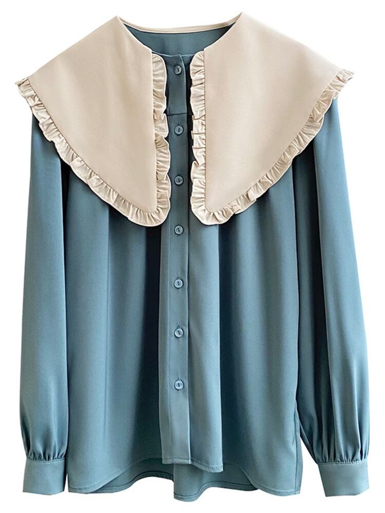 [EWQ] フリル パッチワーク シャツ長袖スウィート シャツ ブラウス トップス春秋紫トップ 16Y6573 ロング 大人ガーリー キュート カジュアル スプリング 春物 オータム 秋物 パープル