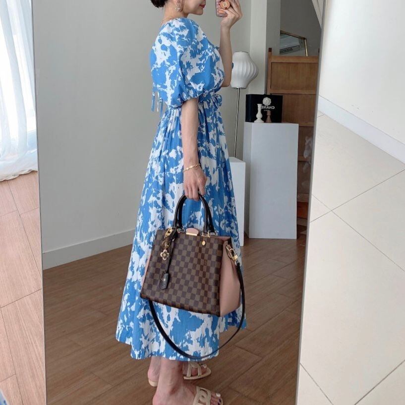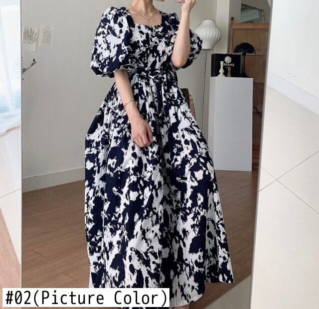 [EWQ] インク プリント レース アップ ドレス春パフ半袖シックルーズ ドレス シックルース Vestidos ショート ハーフスリーブ スプリング 春物 レースアップ