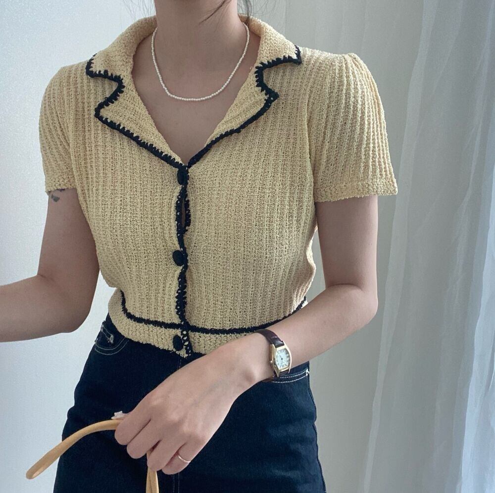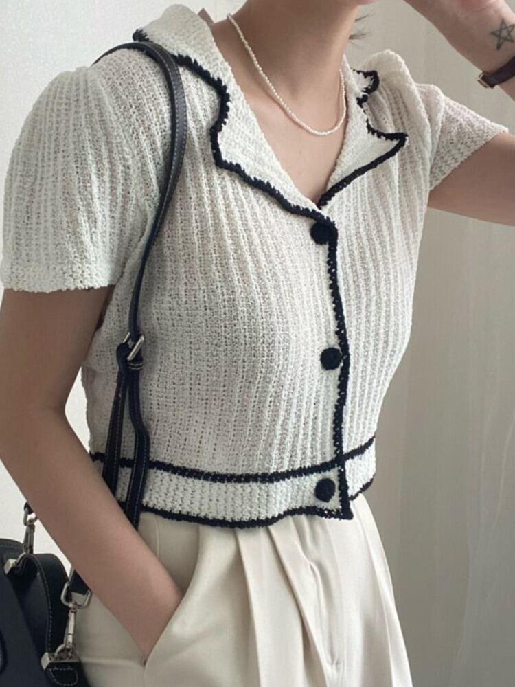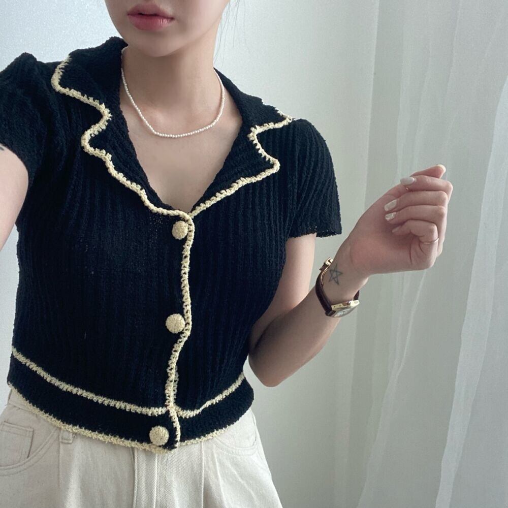 【EWQ】レディースシンプルターンダウンカラーカーディガンコートシングルブレストコントラストニットショートジャケットサマートップスY7127 夏物