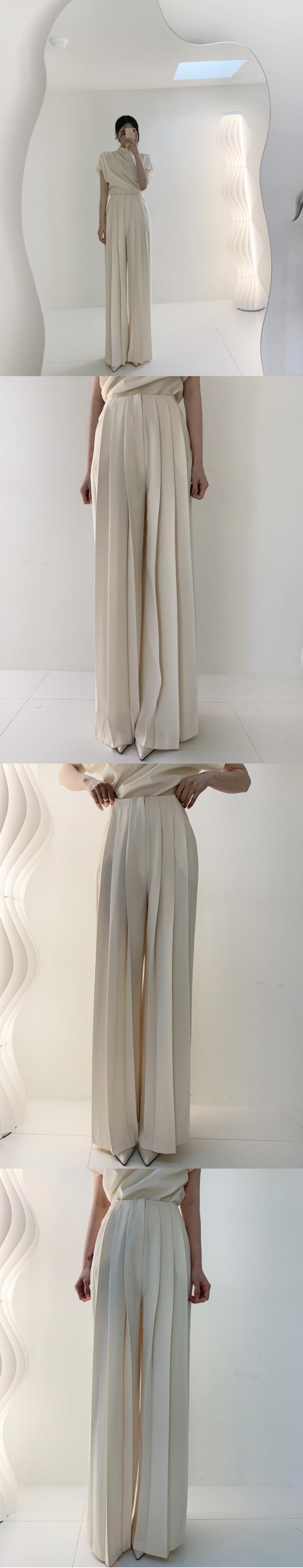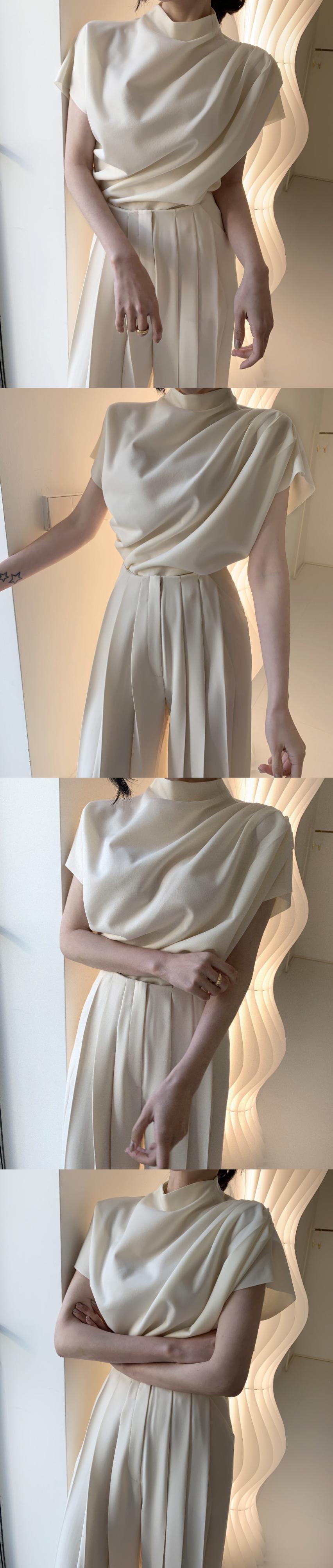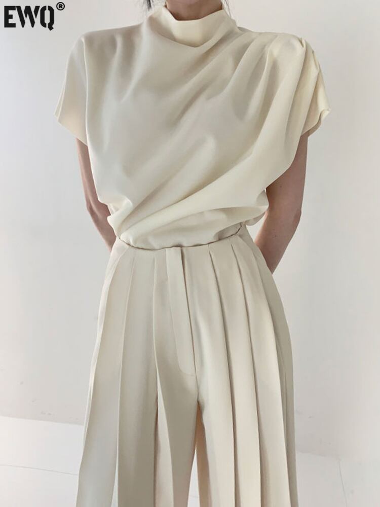 【EWQ】レディース スタンドカラー 半袖 トップス+ウエスト ワイドレッグ パンツ 春 秋 無地 プリーツ セット ショート ハーフスリーブ スプリング 春物 オータム 秋物 ワイドパンツ ソリッドカラー
