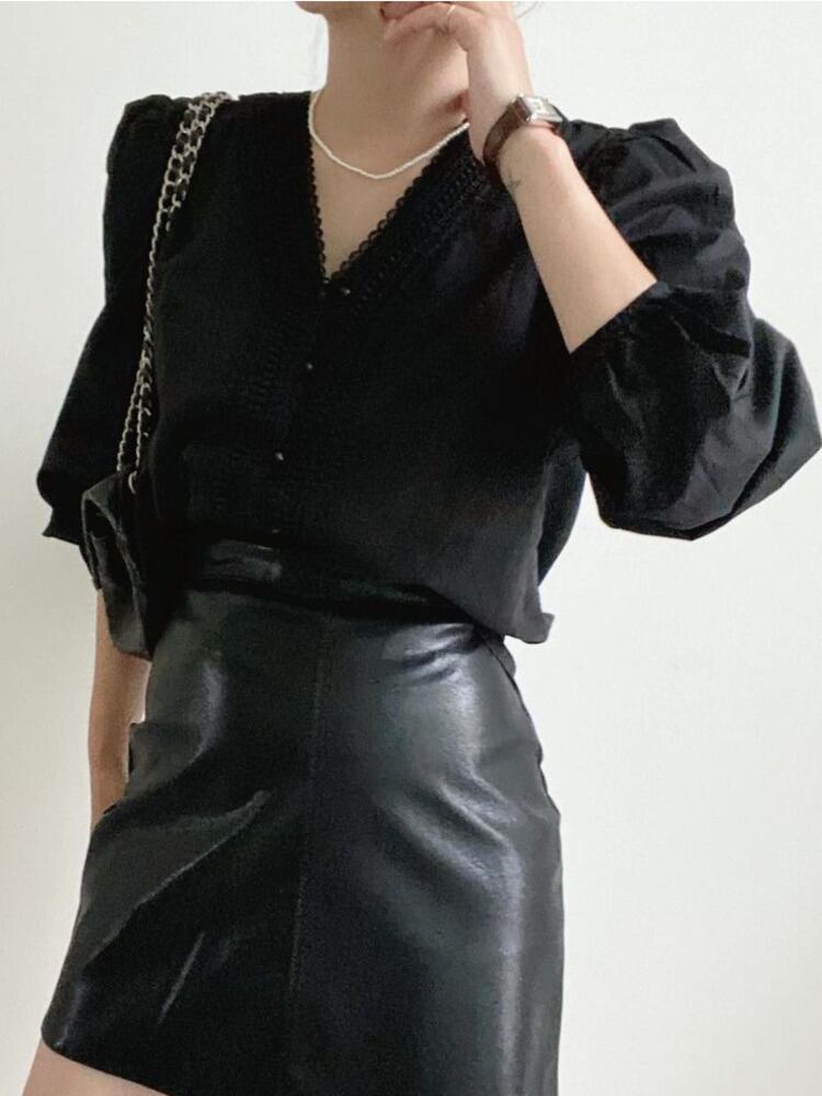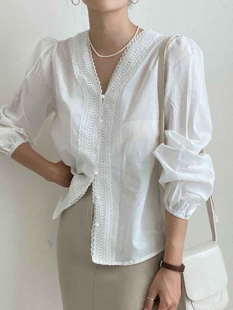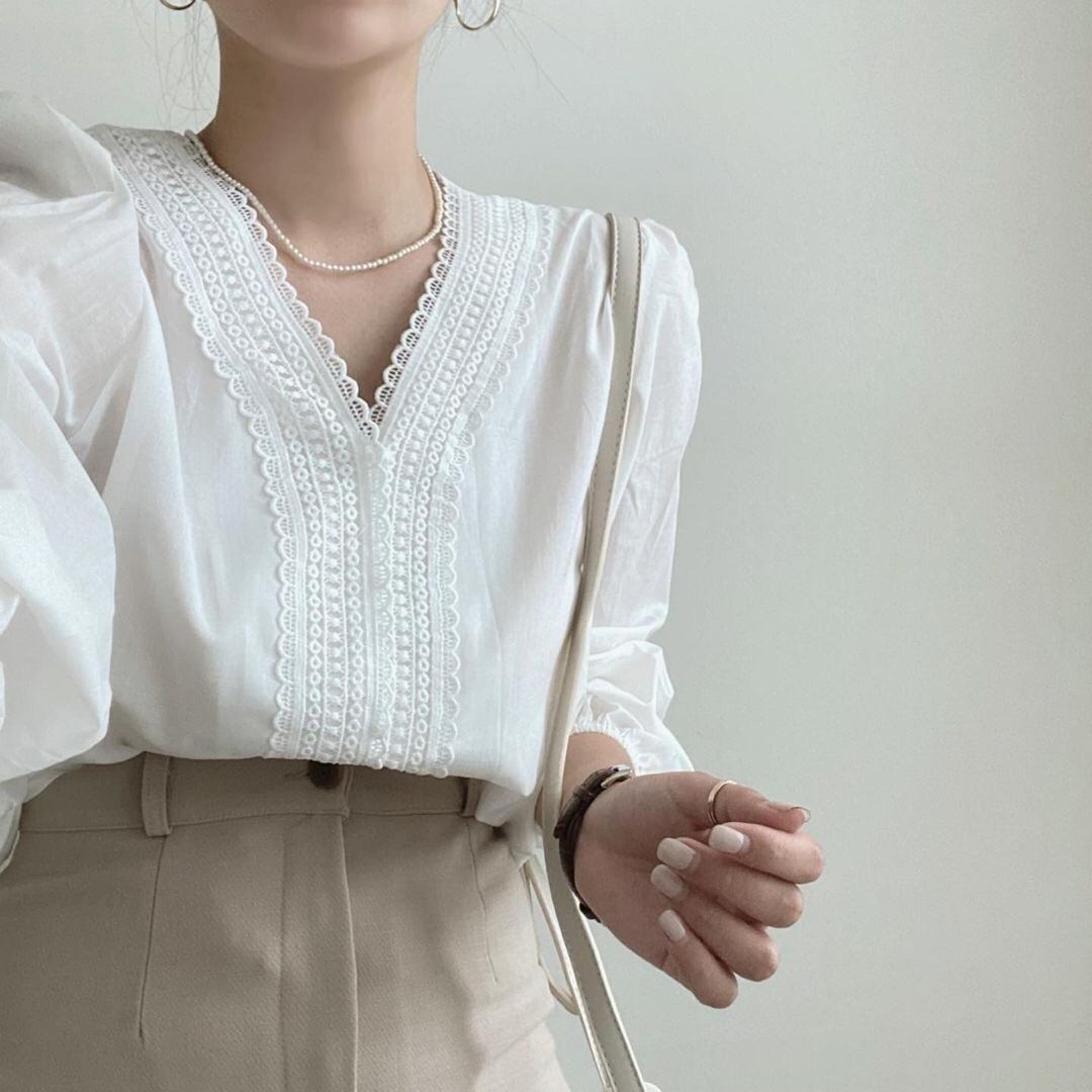 【EWQ】ホックフラワー中空Vネックシャツ レディース 刺繍 ゆったり 長袖 無地 トップス 春秋 6978 ロング スプリング 春物 オータム 秋物 ソリッドカラー フラワーデザイン