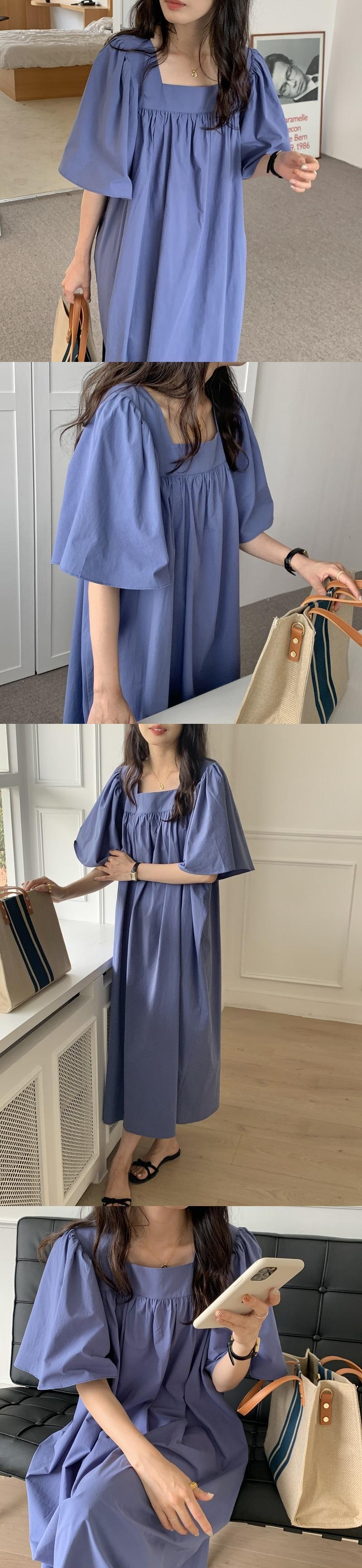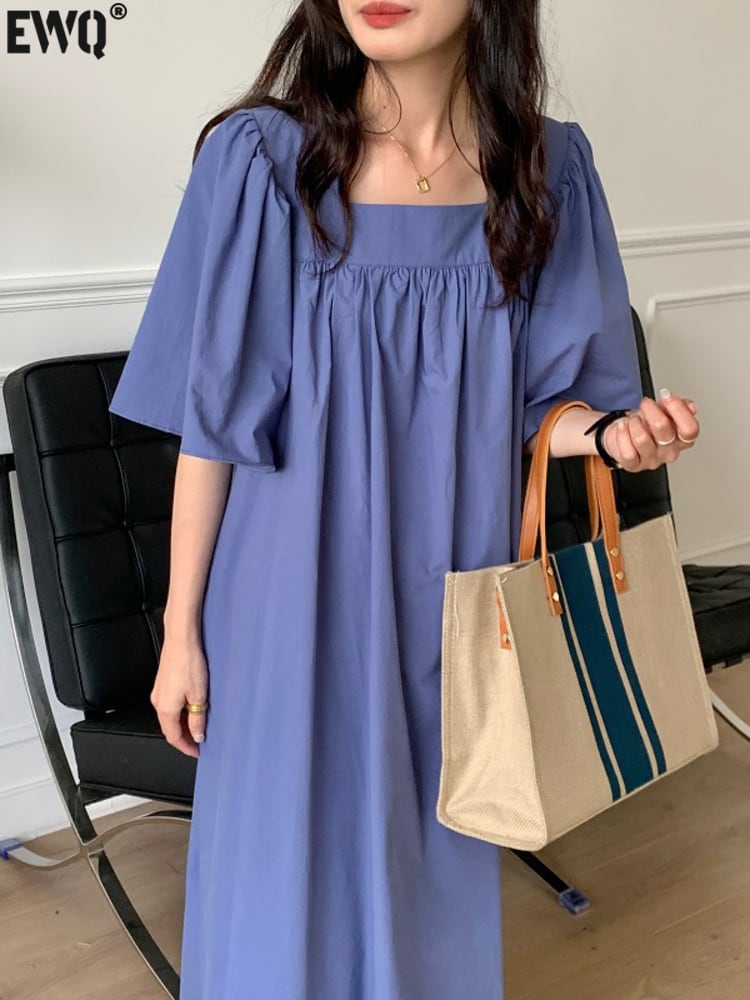 [EWQ] ブルースクエアカラードレス半袖プリーツルーズカジュアルドレスサマータイド Vestido Y7547 ショート ハーフスリーブ 夏物 スクウェア