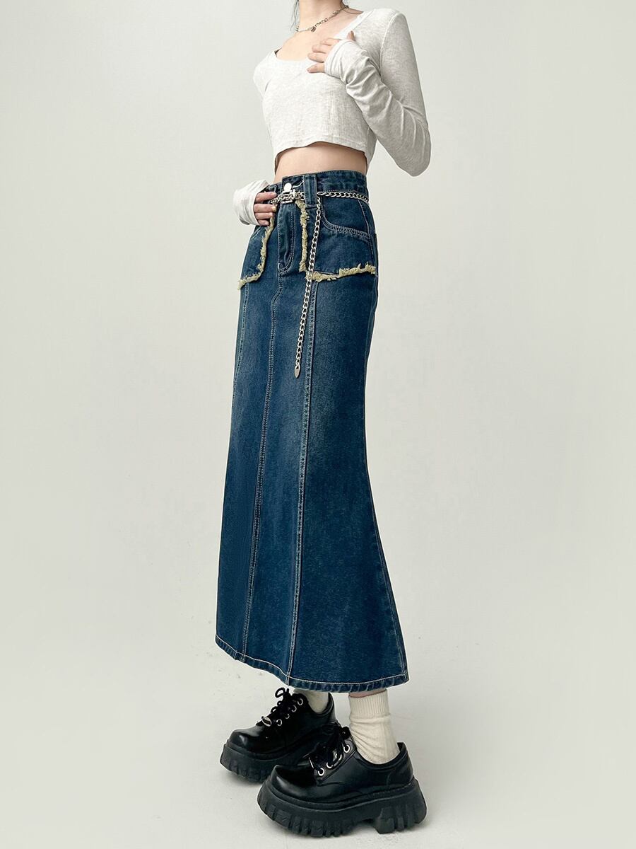 [EWQ] レディース ポケット パッチワーク トランペット スカート ウエスト ブルー ミッドカーフ スカート 春夏 ファルダス 80 スプリング 春物 サマー 夏物