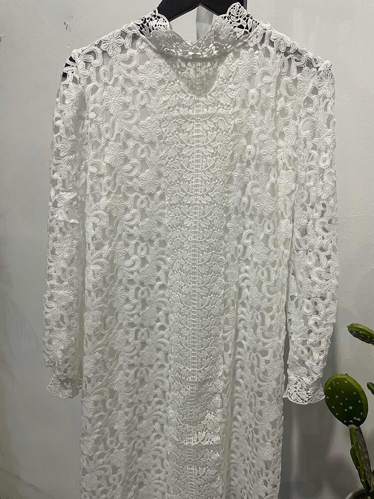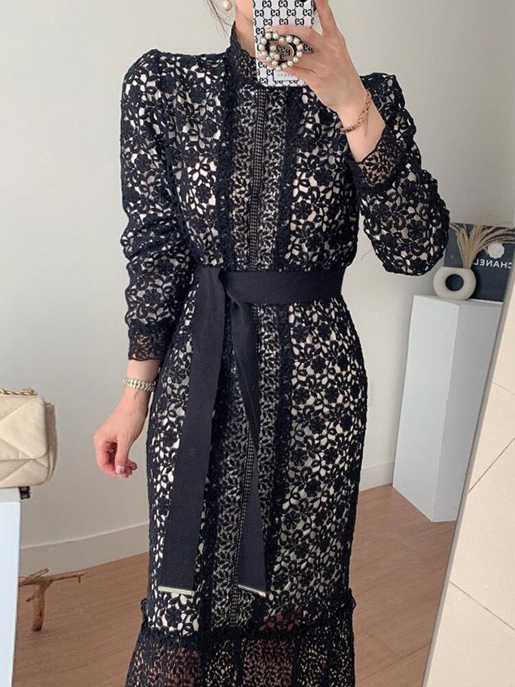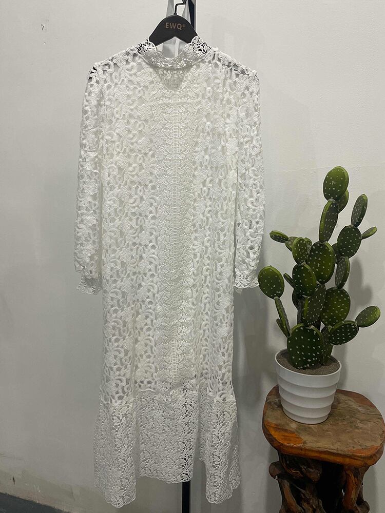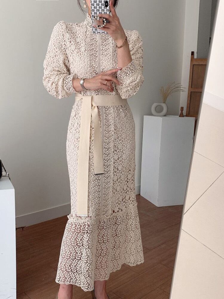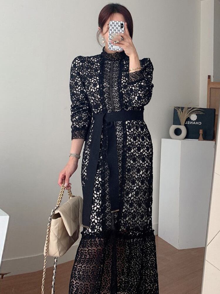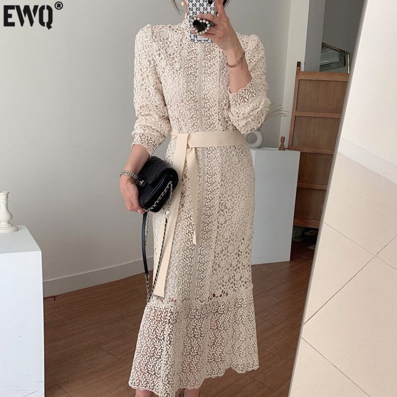 [EWQ] 韓国シック スタンドカラー レース ホックホック フラワー レースアップ ロングスリーブ ドレス キレイめ レディース スリム ローブ 6Y3946 長袖 フラワーデザイン