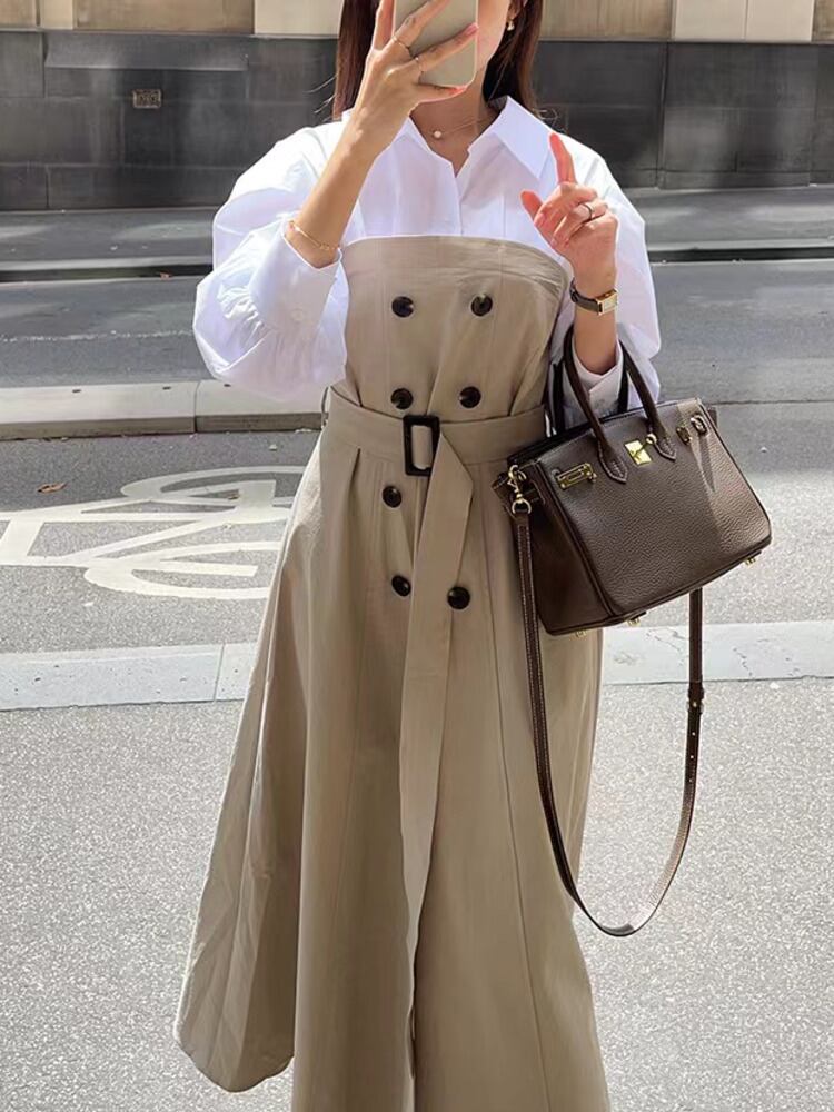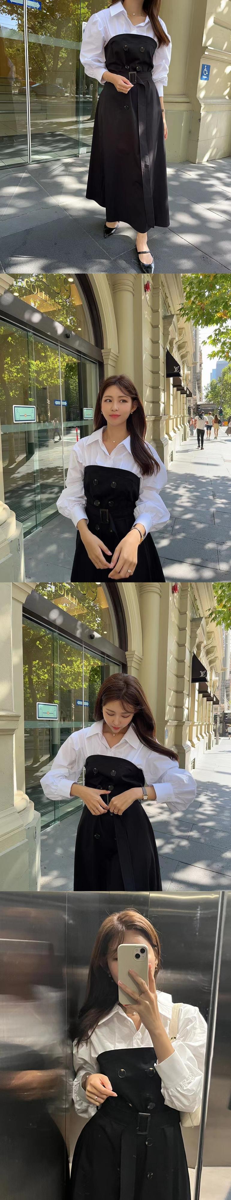 [EWQ] コントラストラペルシャツスプライシングフェイクツーピースドレスレースアップパッチワークボタンドレス春秋 Vestido スプリング 春物 オータム 秋物