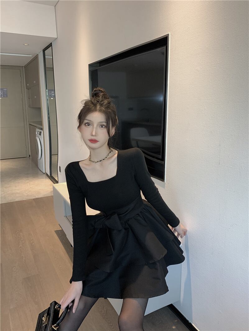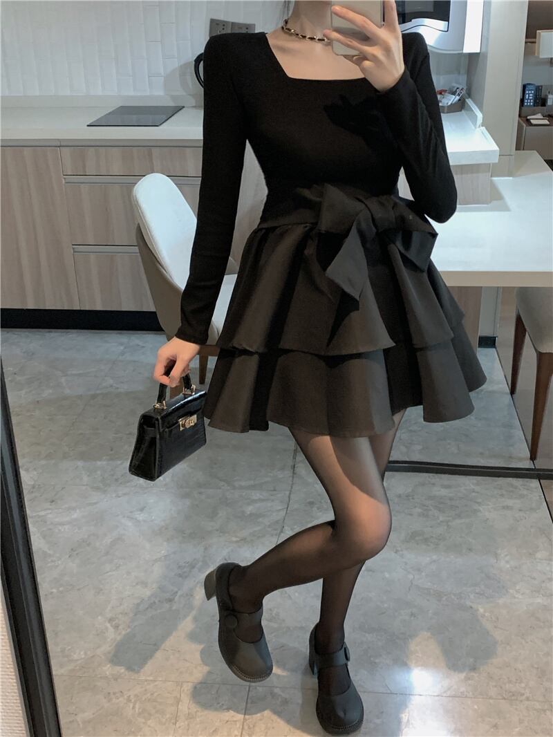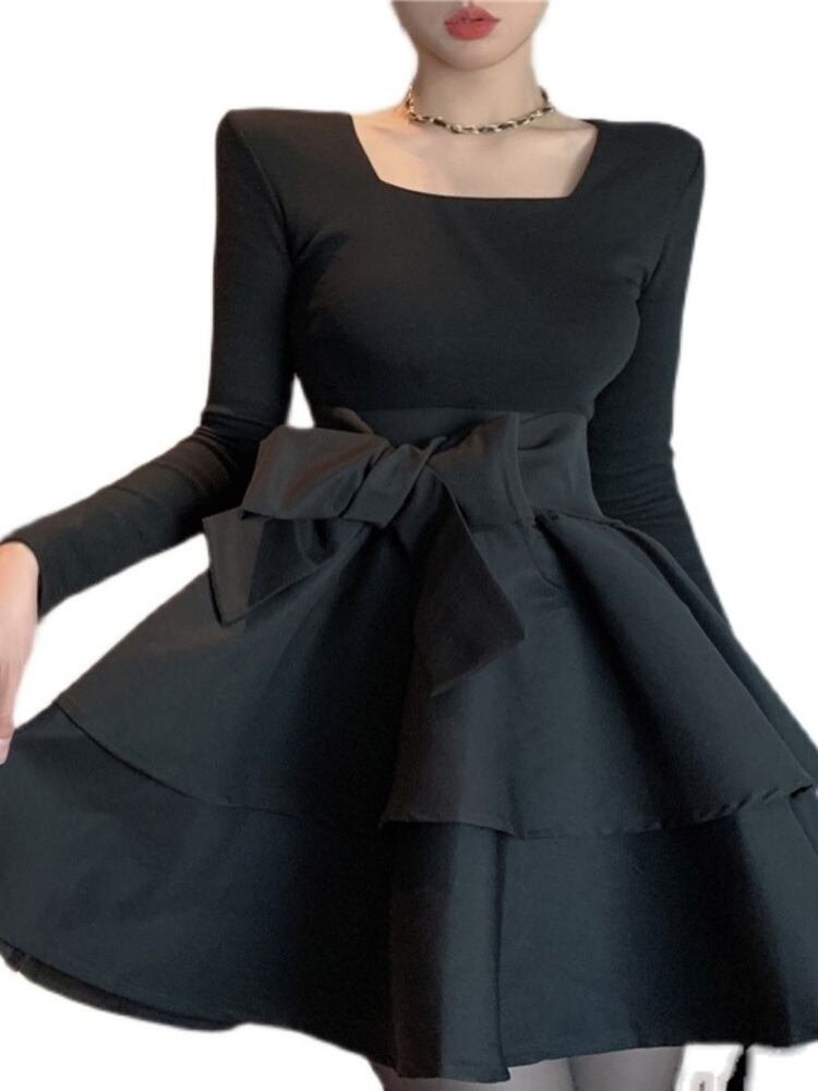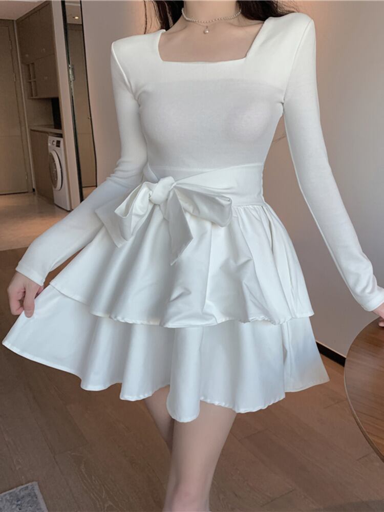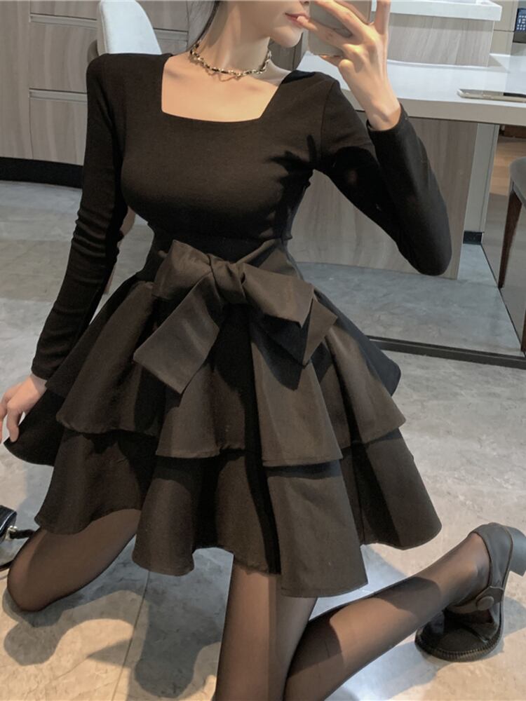 [EWQ] 甘い長袖スクエア カラー ボール ガウン ドレス春秋 A ライン ボウ スプライシング ティアード ドレス 16Y568 ロング レッド リボン 大人ガーリー スウィート キュート カジュアル スプリング 春物 オータム 秋物 Aライン スクウェア