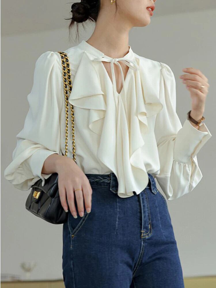 【EWQ】 フリル レースアップ ホルター Vネック シャツ レディース 長袖 シフォンシャツ キレイめ トップス 春夏 16Y5875 ロング ラッフル スプリング 春物 サマー 夏物