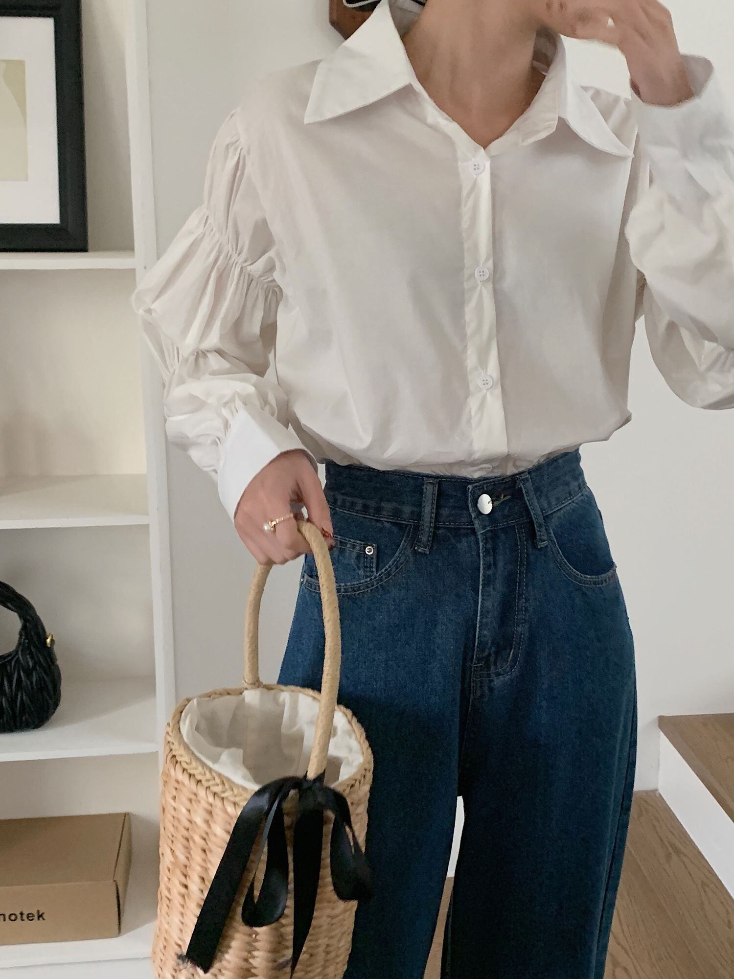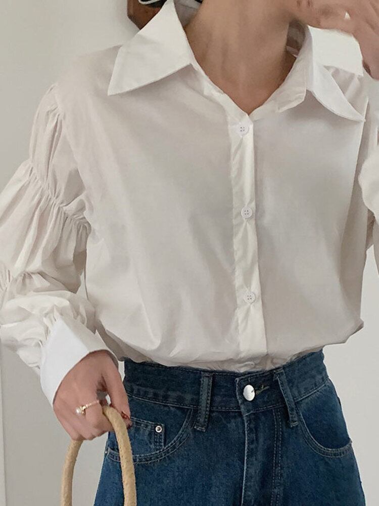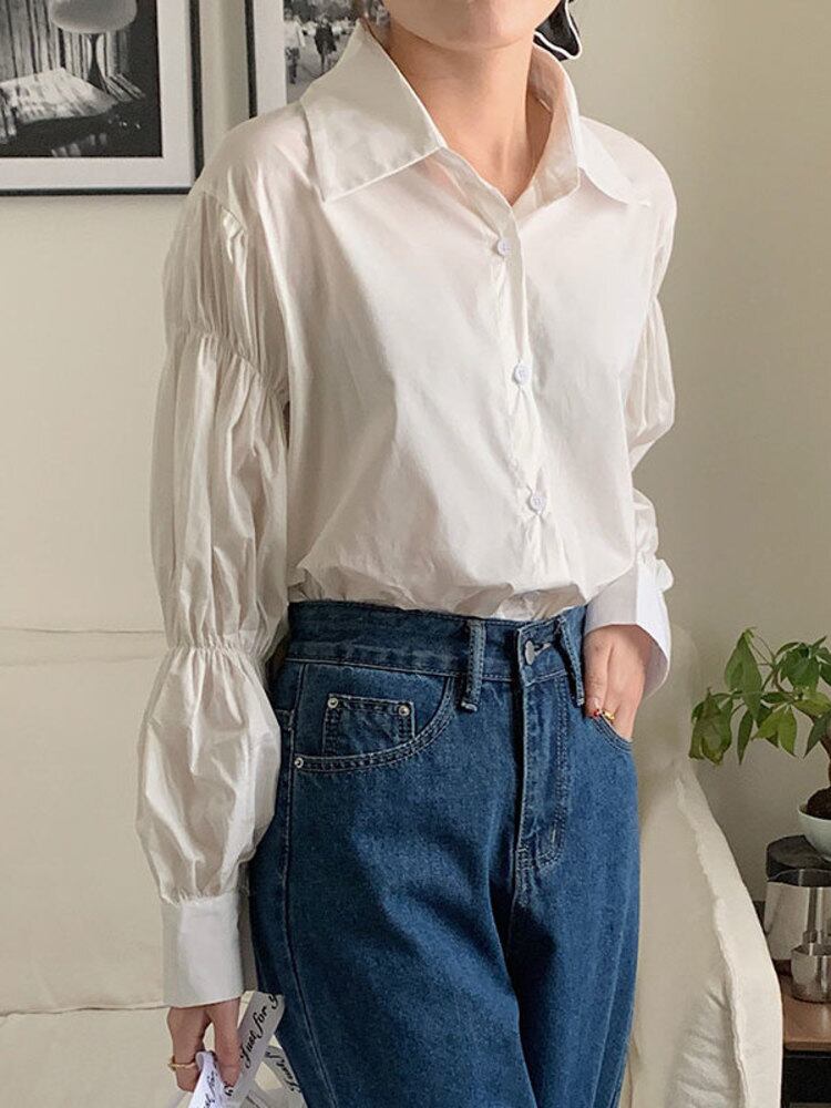 [EWQ] シンプルラペルルーズシャツシャーリング長袖無地ブラウストップス春秋トップス 6Y6948 ロング スプリング 春物 オータム 秋物 ソリッドカラー