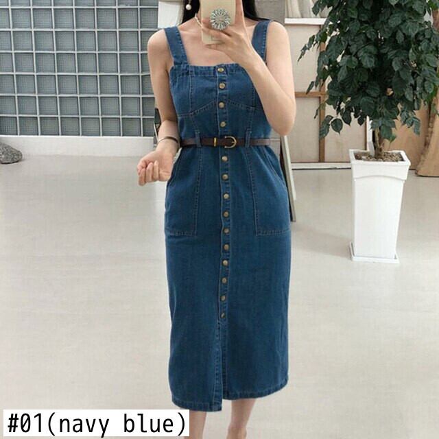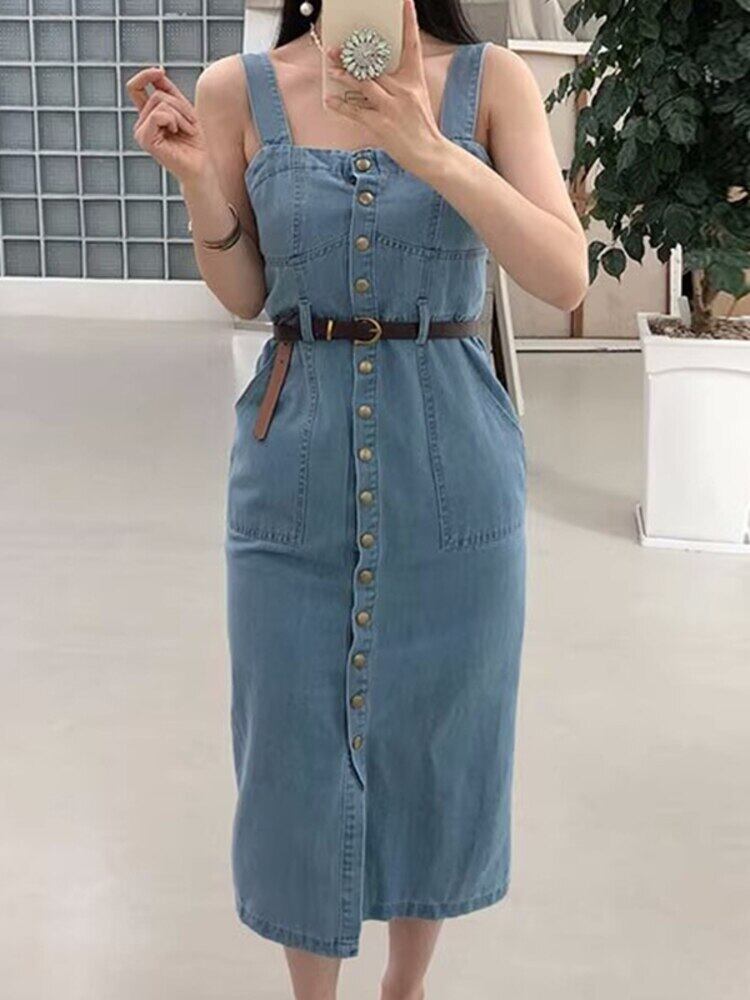 [EWQ] レースアップ デニム ドレス ノースリーブ スリム フィット メタル シングル ブレスト ドレス夏潮 Vestidos 16Y8415 サマー 夏物