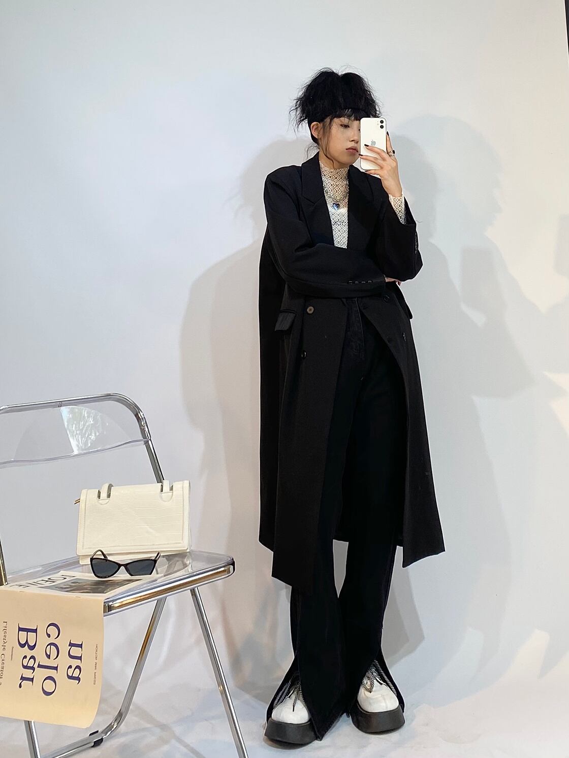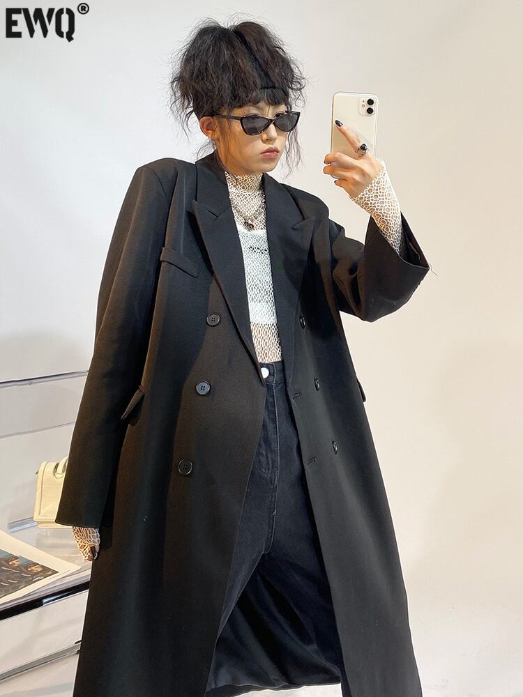 [EWQ] 秋ミディアムロングブラックブレザーノッチダブルブレストルーズエンドスーツコート 16R1835 オータム 秋物
