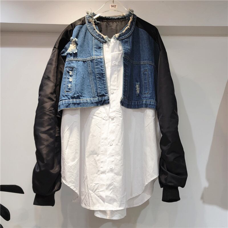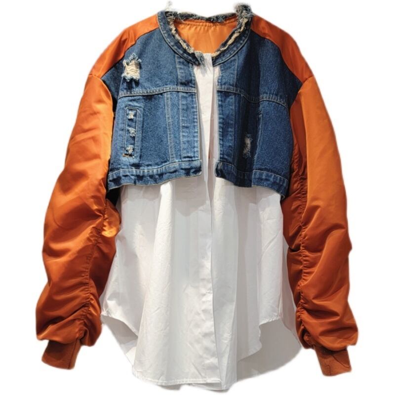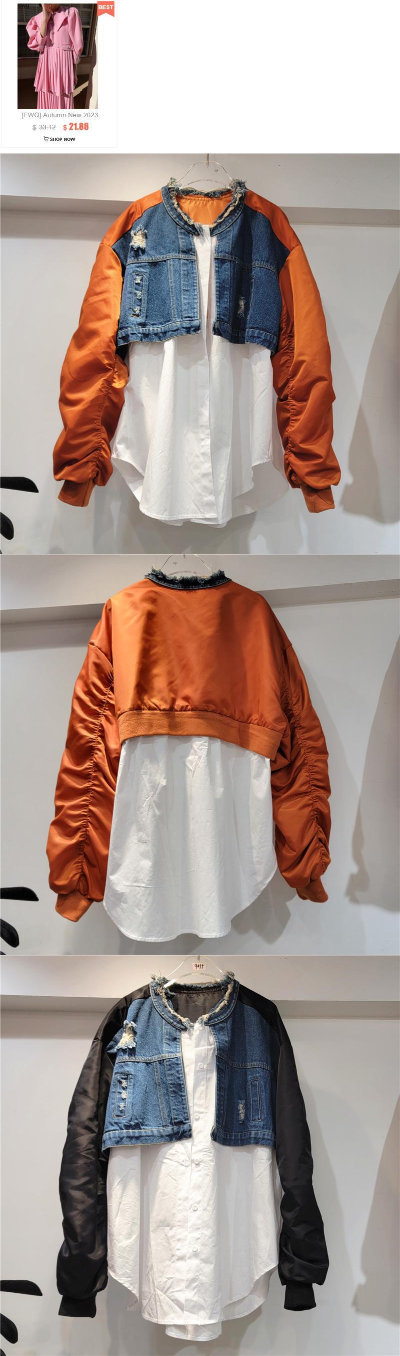[EWQ]長袖パッチワーク デニム ジャケット コントラスト O ネック ストリート ジャケット コート春秋トップ ロング スプリング 春物 オータム 秋物 Oネック