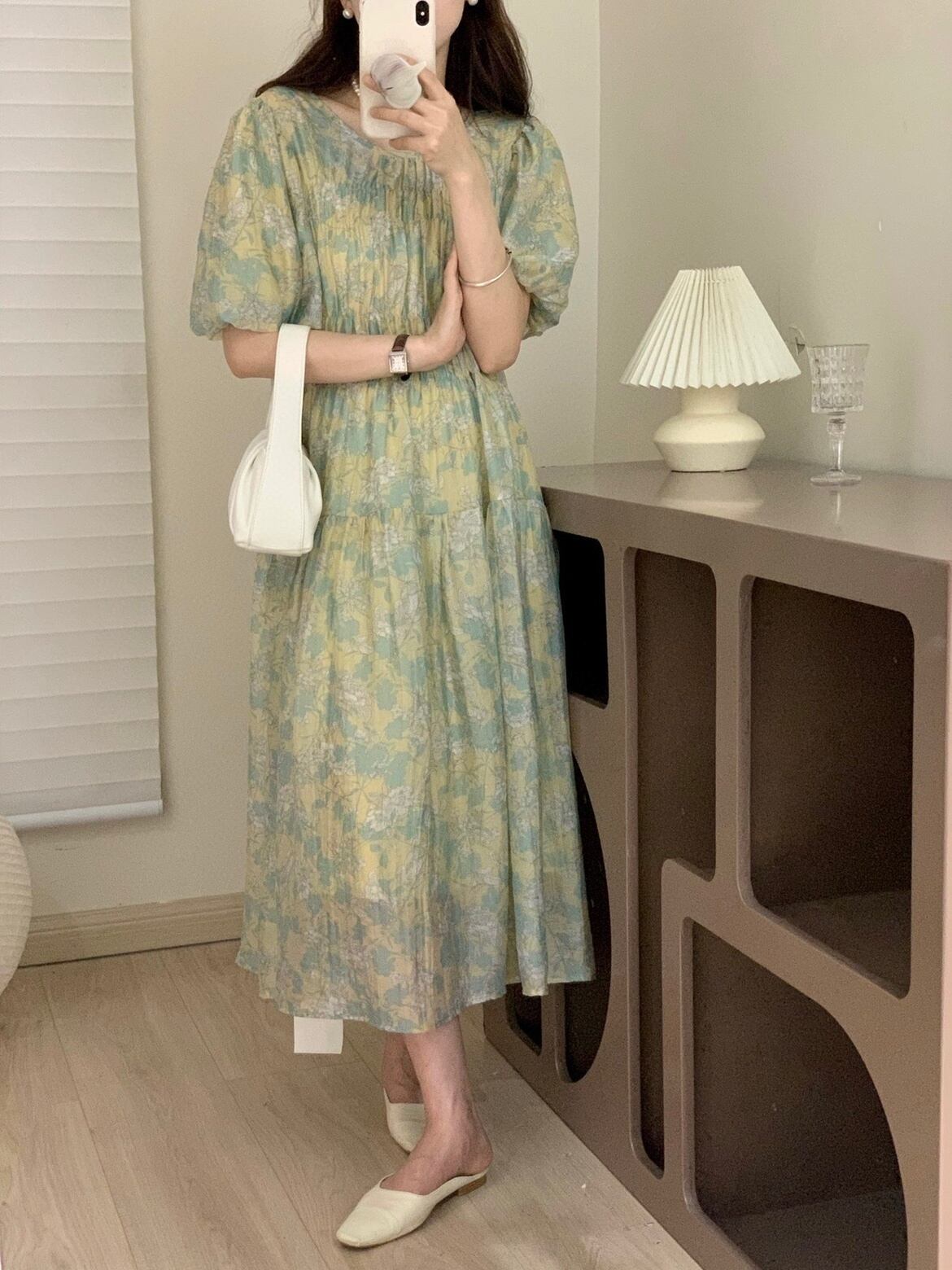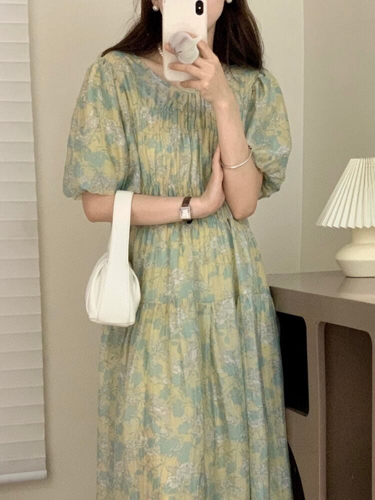 [EWQ] 花柄ドレス コントラスト カラー パフ スリーブ プリーツ ウエスト ドレス夏 Vestido サマー 夏物