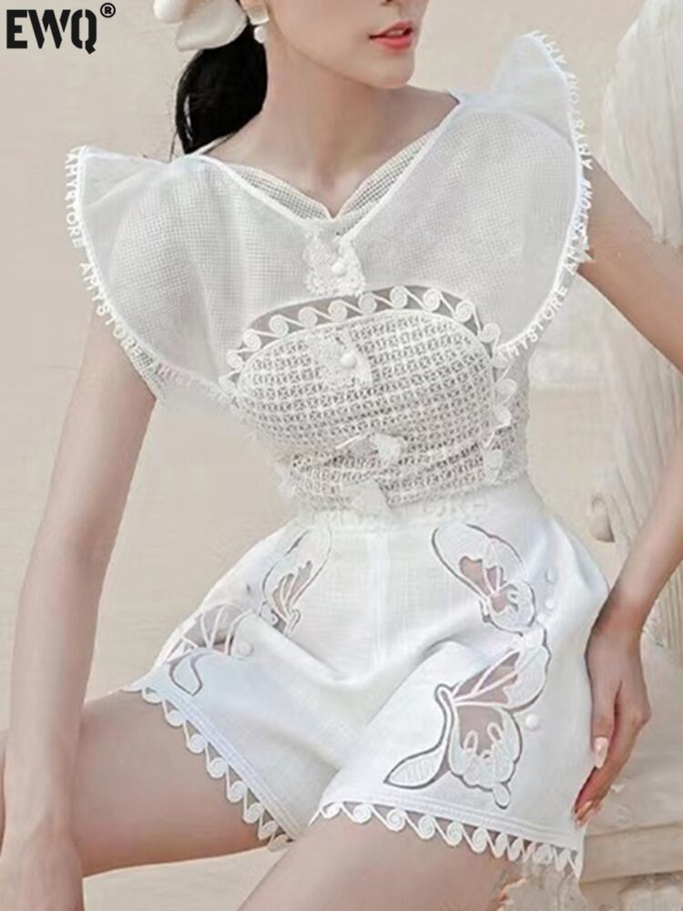【EWQ】スウィート レディース フラワー 中空 ノースリーブ トップス レース ウエスト ショートパンツ シック ツーピース セット 春夏 スーツ 16Y5 大人ガーリー キュート カジュアル スプリング 春物 サマー 夏物 フラワーデザイン